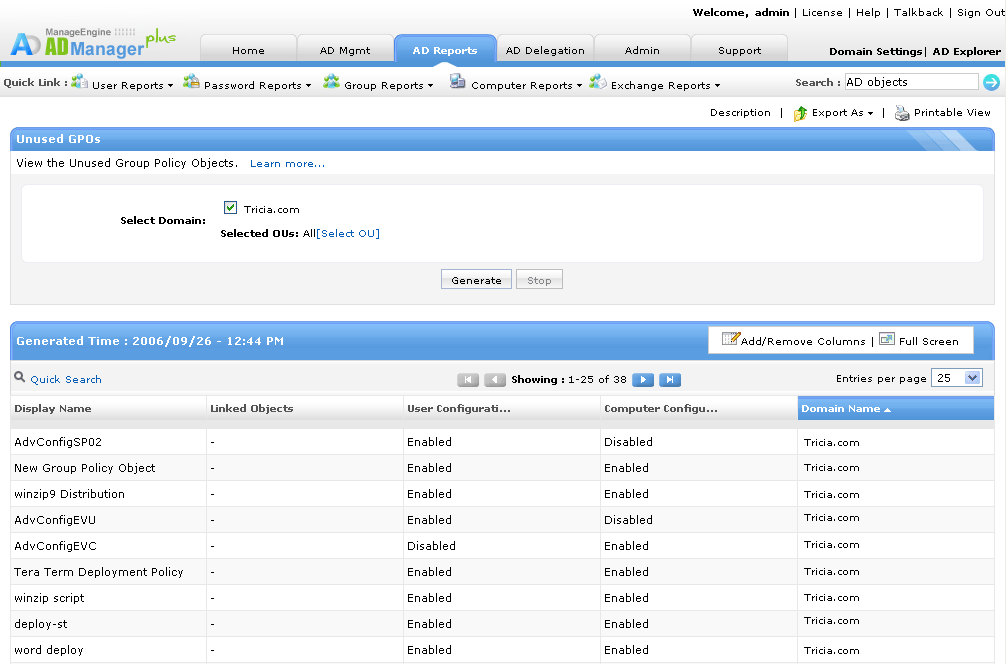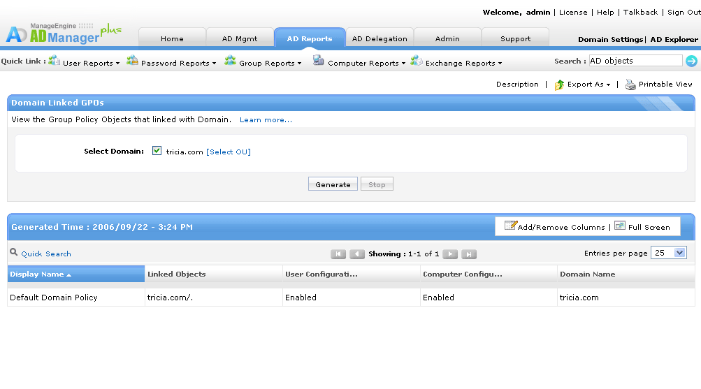 Domena zawiera wiele jednostek organizacyjnych i użytkowników domeny, z różnymi konfiguracjami i funkcjami dla każdego z nich. Każda jednostka organizacyjna może być przypisana do GPO (obiektu zasad grupy), umożliwiając przypisanie różnych zestawów zasad do różnych zestawów obiektów/użytkowników. GPO zapewnia możliwość zdalnej konfiguracji w sieciach Windows. Raporty GPO (obiektów zasad grupy) z ADManager Plus pomagają administratorom przez generowanie oraz wysyłanie szczegółowych raportów w formatach możliwych do odczytu. Narzędzie to pomaga administratorom w bezproblemowym zarządzaniu wszystkimi zasadami grup w organizacji przy pomocy swojej funkcji zarządzania zasadami grupy (GPO).