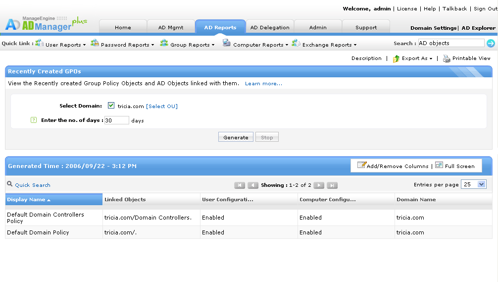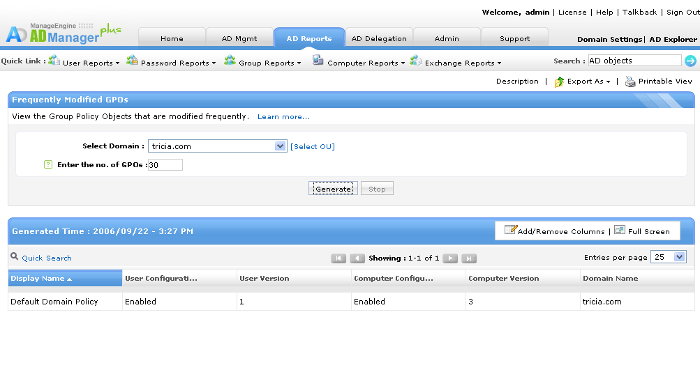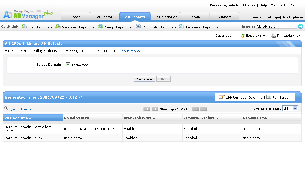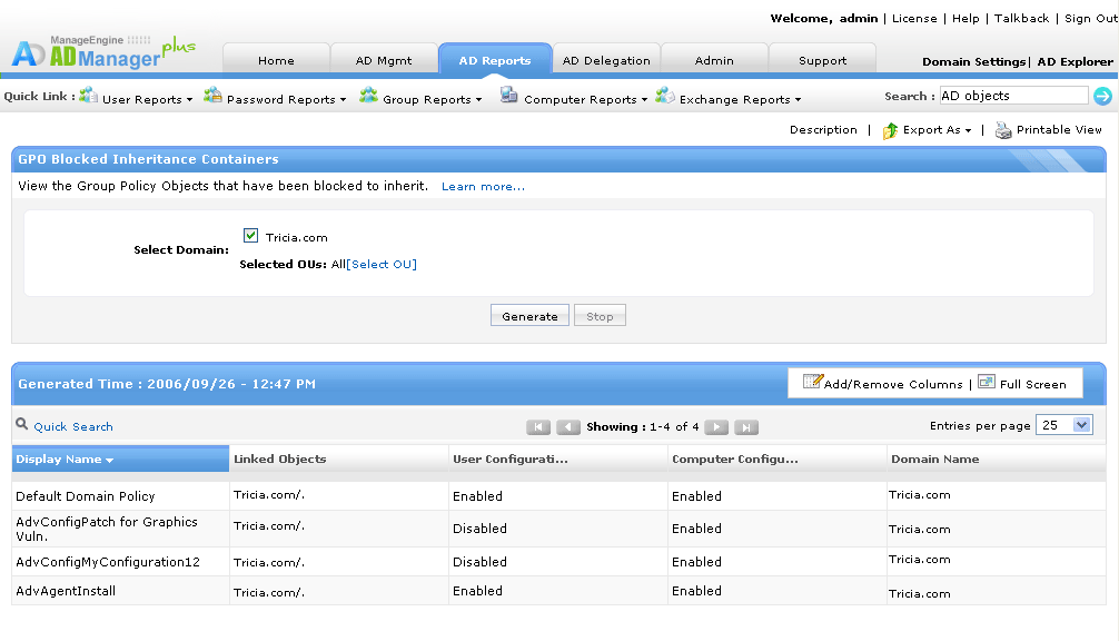 Domena zawiera wiele jednostek organizacyjnych i użytkowników domeny, z różnymi konfiguracjami i funkcjami dla każdego z nich. Każda jednostka organizacyjna może być przypisana do GPO (obiektu zasad grupy), umożliwiając przypisanie różnych zestawów zasad do różnych zestawów obiektów/użytkowników. GPO zapewnia możliwość zdalnej konfiguracji w sieciach Windows. Raporty GPO (obiektów zasad grupy) z ADManager Plus pomagają administratorom przez generowanie oraz wysyłanie szczegółowych raportów w formatach możliwych do odczytu. Narzędzie to pomaga administratorom w bezproblemowym zarządzaniu wszystkimi zasadami grup w organizacji przy pomocy swojej funkcji zarządzania zasadami grupy (GPO).