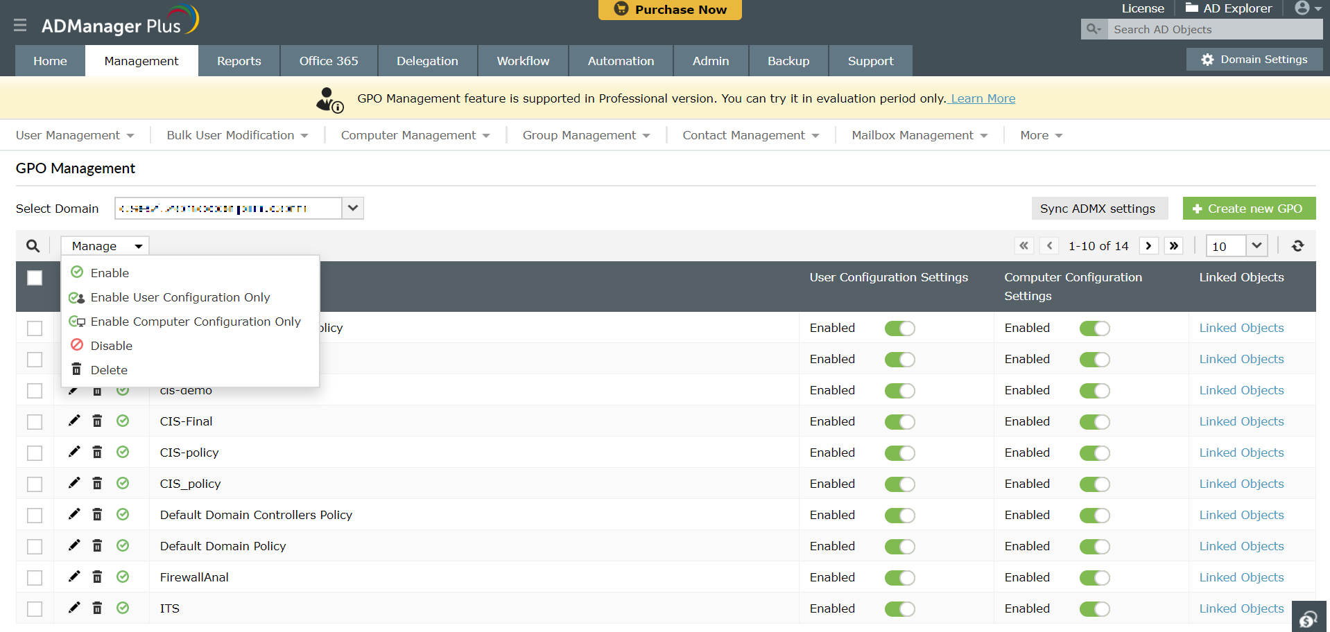 Oprócz umożliwienia łatwego zarządzania GPO narzędzie to pomaga również w pobieraniu szczegółowych informacji poprzez wbudowane w oprogramowanie raporty GPO. Dzięki ADManager Plus wszystkie te zadania są proste i można je wykonać za pomocą jednego kliknięcia.