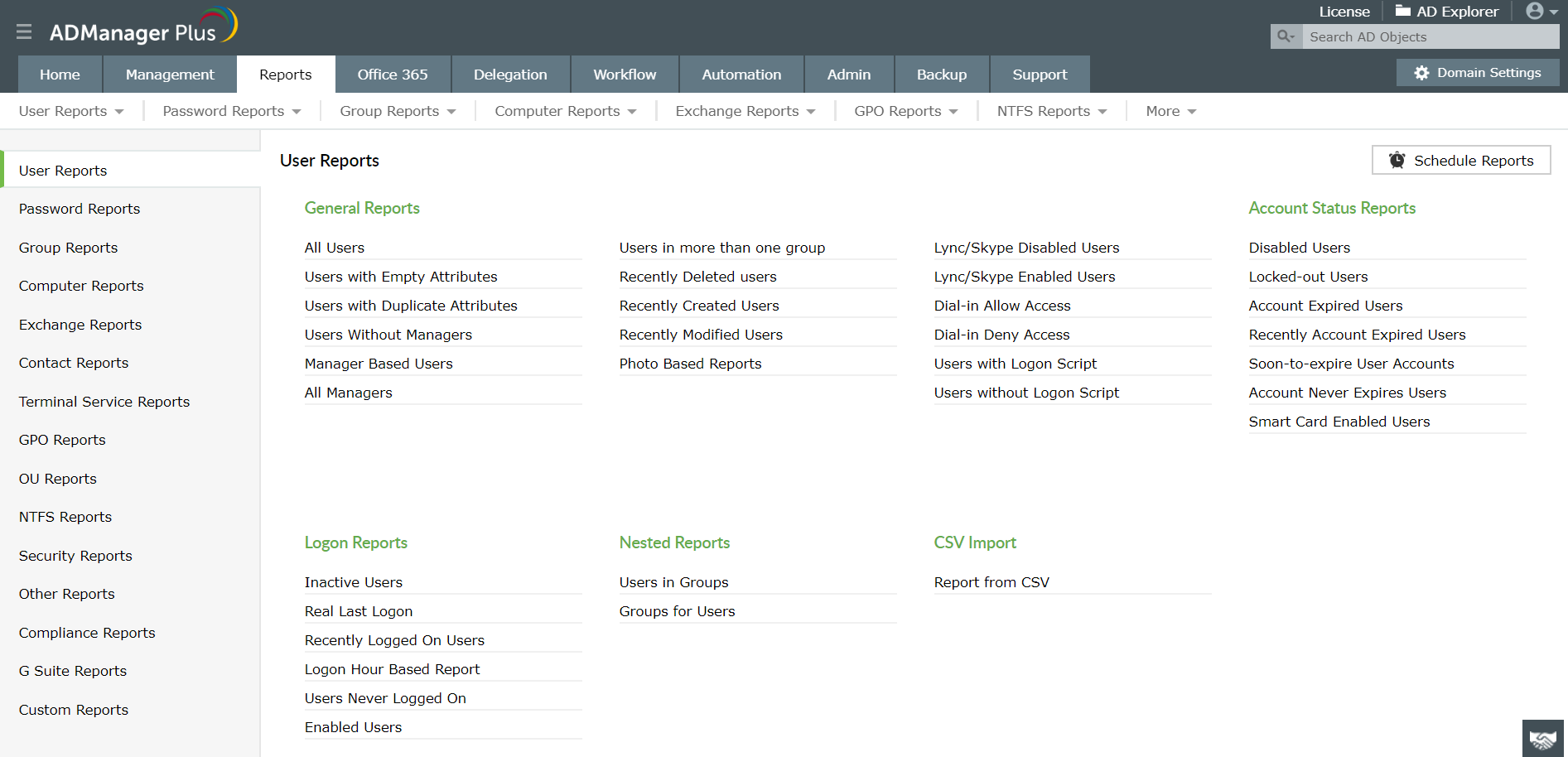 ADManager Plus, ze swoimi ponad 200 wstępnie przygotowanymi raportami, które pobierają szczegółowe dane na temat każdego aspektu Active Directory, zapewnia Ci dostęp do potrzebnych informacji za jednym kliknięciem przycisku. Wszystkie raporty tego narzędzia są umieszczone w różnych kategoriach np.: