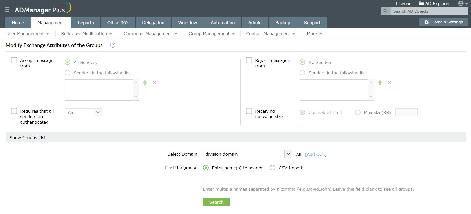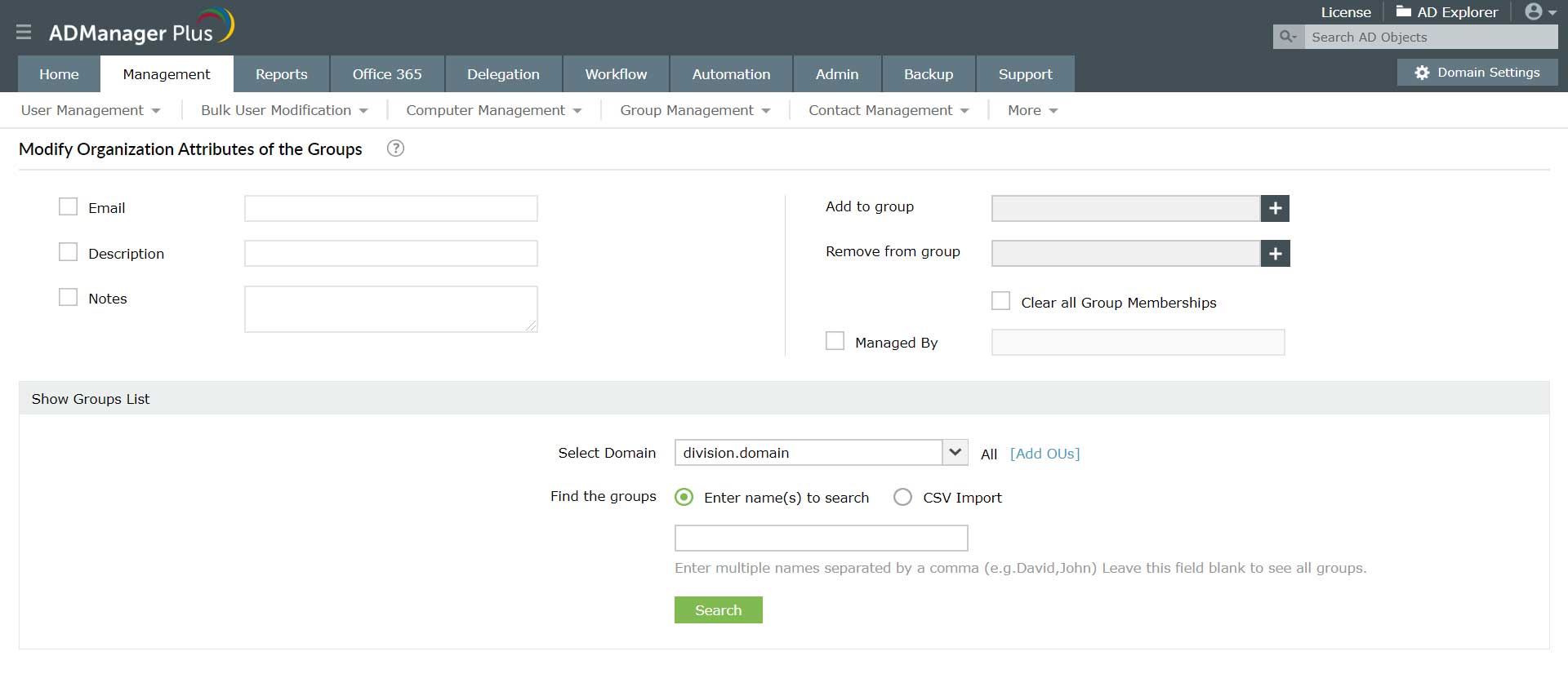 Program ADManager Plus pozwala administratorowi na zbiorcze usuwanie grup usługi Active Directory zamiast usuwania ich pojedynczo za pomocą natywnych narzędzi AD.