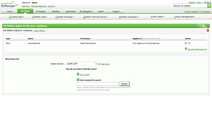 Dzięki ADManager Plus można łatwo tworzyć zbiorowo użytkowników z włączoną obsługą poczty, po prostu importując plik CSV. Ponadto administratorzy mogą ustawić dowolne ograniczenia dla grup i kontaktów z włączoną obsługą poczty, w celu ochrony przed naruszeniami bezpieczeństwa.