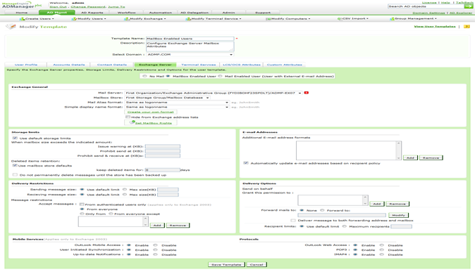ADManager Plus pozwala na łatwe tworzenie i modyfikowanie udostępnianych skrzynek pocztowych oraz skrzynek pocztowych zasobów (pomieszczeń i urządzeń) w różnych wersjach serwera programu Exchange. Ułatwia również tworzenie zdalnych skrzynek pocztowych w Exchange Server 2010, 2013, oraz 2016 przy inicjowaniu obsługi nowych kont AD dla użytkowników, zarówno indywidualnie jak i zbiorowo.