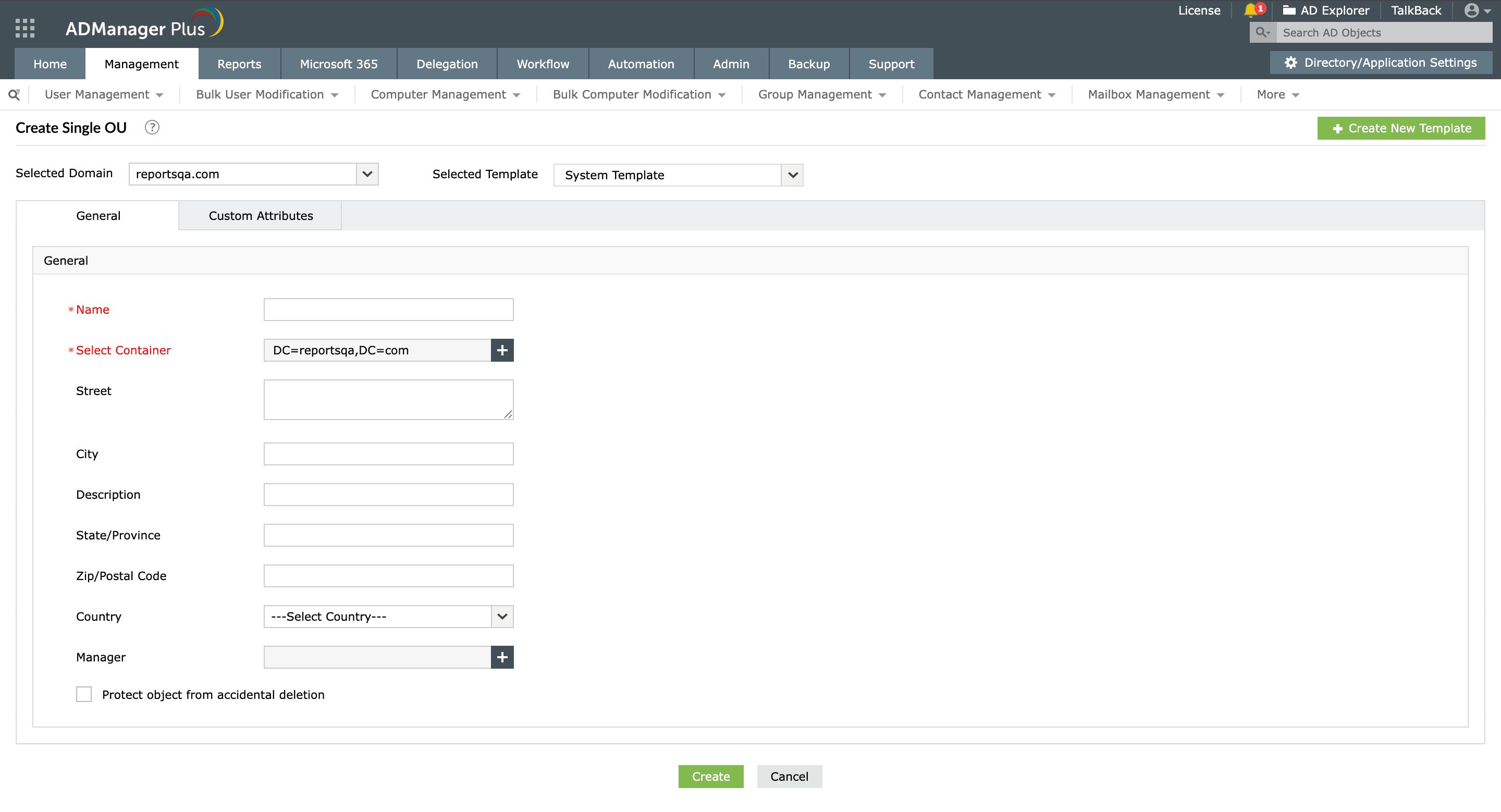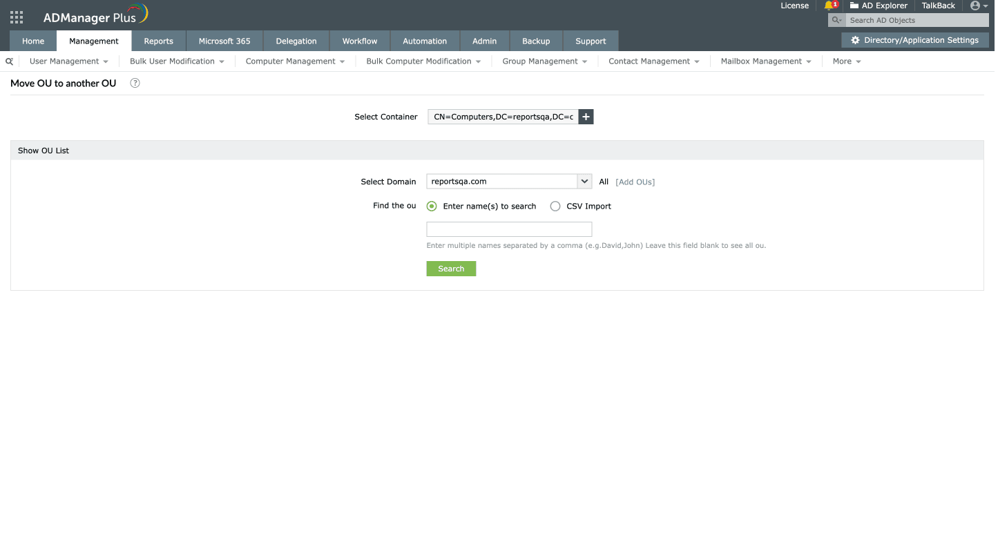 Ta funkcja ADManager Plus ułatwia zarządzanie jednostkami organizacyjnymi i eliminuje prawdopodobieństwo błędów. Ponadto jest ona dużo bardziej przyjazna dla użytkownika niż natywne narzędzia — nie wykorzystuje skryptów i jest dostępna przez Internet.