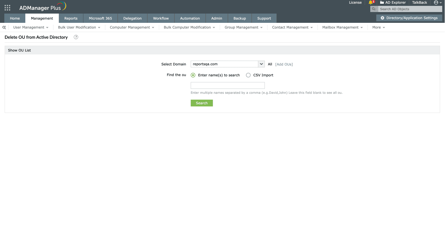 Usuwanie jednostek organizacyjnych daje możliwość usuwania niepożądanych lub niewykorzystywanych jednostek organizacyjnych z Active Directory. Funkcja ta oferuje również wbudowaną opcję wyszukiwania pozwalającą na znalezienie tych jednostek, które chce się usunąć. Można również podać w pliku CSV listę jednostek organizacyjnych do usunięcia i usunąć je wszystkie naraz.