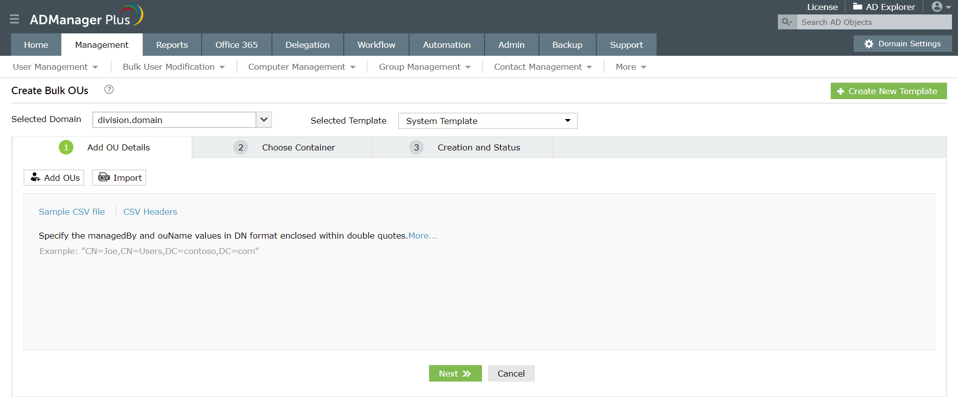 Modyfikacja jednostek organizacyjnych przez importowanie CSV:modyfikowanie wielu atrybutów jednostki organizacyjnej lub grupy jednostek organizacyjnych naraz. Wystarczy utworzyć plik CSV z nazwami jednostek organizacyjnych do zmodyfikowania oraz nowymi wartościami pożądanych atrybutów i zaimportować go do ADManager Plus; wszystkie podane jednostki organizacyjne zostaną zaktualizowane przy użyciu nowych wartości. To znacząco upraszcza proces modyfikacji jednostki organizacyjnej.
