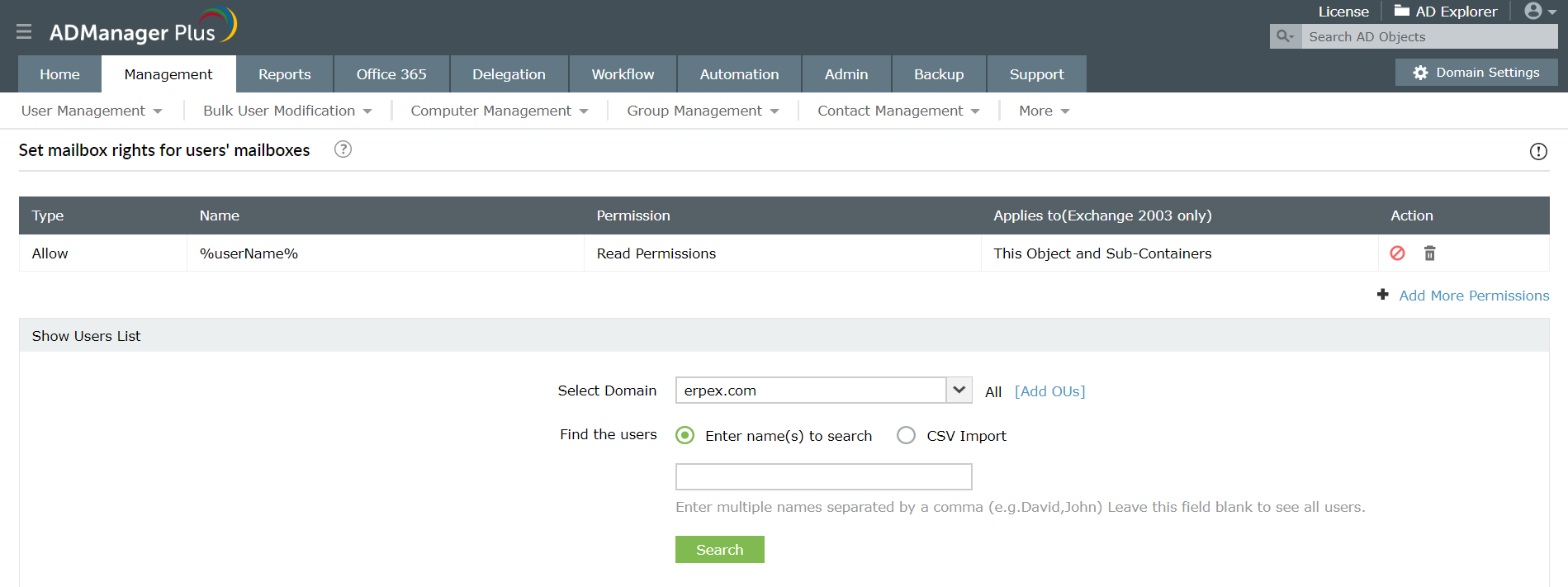 Dzięki ADManager Plus można łatwo tworzyć zbiorowo użytkowników z włączoną obsługą poczty, po prostu importując plik CSV. Ponadto administratorzy mogą ustawić dowolne ograniczenia dla grup i kontaktów z włączoną obsługą poczty, w celu ochrony przed naruszeniami bezpieczeństwa.