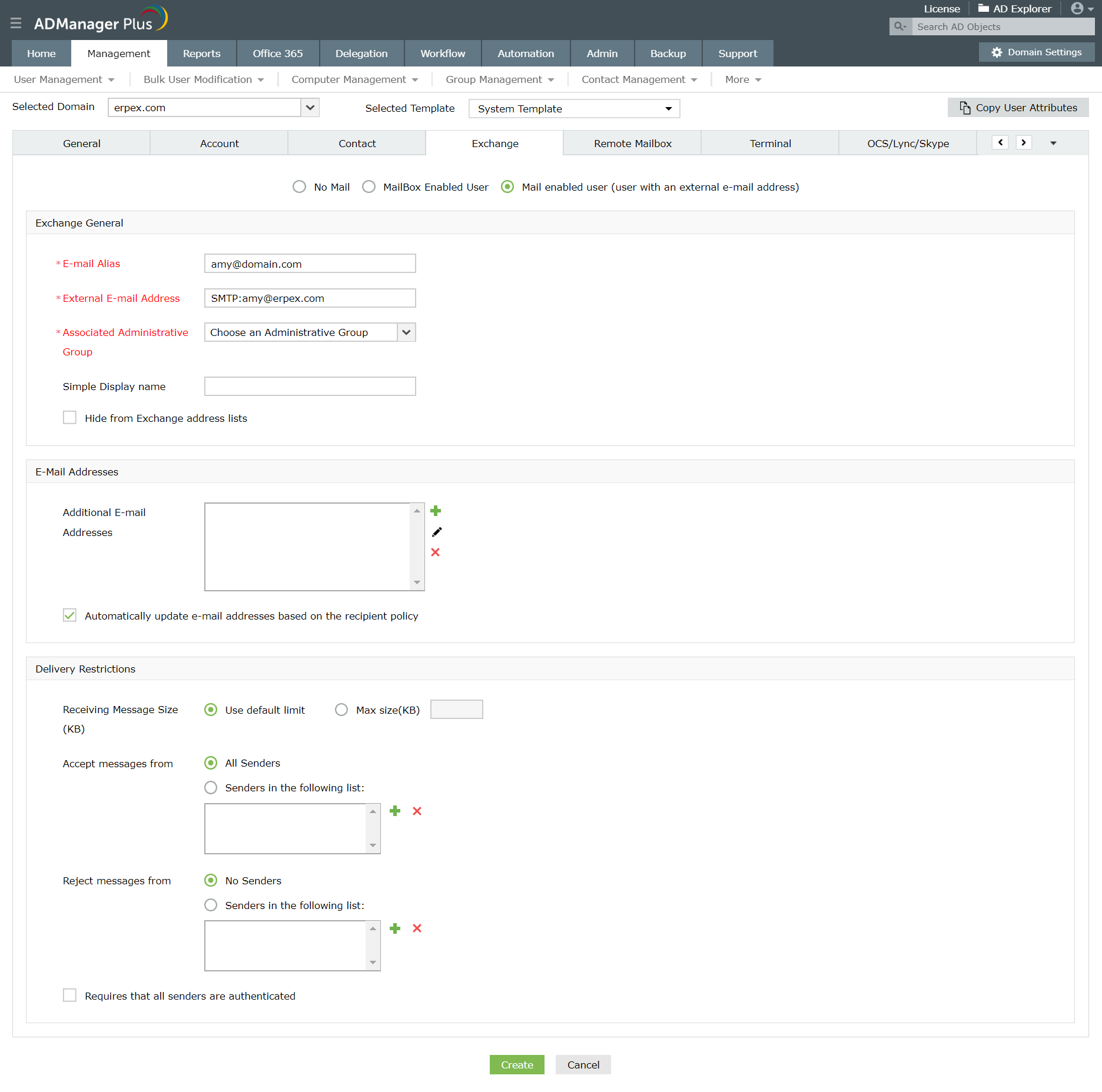 ADManager Plus pozwala na łatwe tworzenie i modyfikowanie udostępnianych skrzynek pocztowych oraz skrzynek pocztowych zasobów (pomieszczeń i urządzeń) w różnych wersjach serwera programu Exchange. Ułatwia również tworzenie zdalnych skrzynek pocztowych w Exchange Server 2010, 2013, oraz 2016 przy inicjowaniu obsługi nowych kont AD dla użytkowników, zarówno indywidualnie jak i zbiorowo.