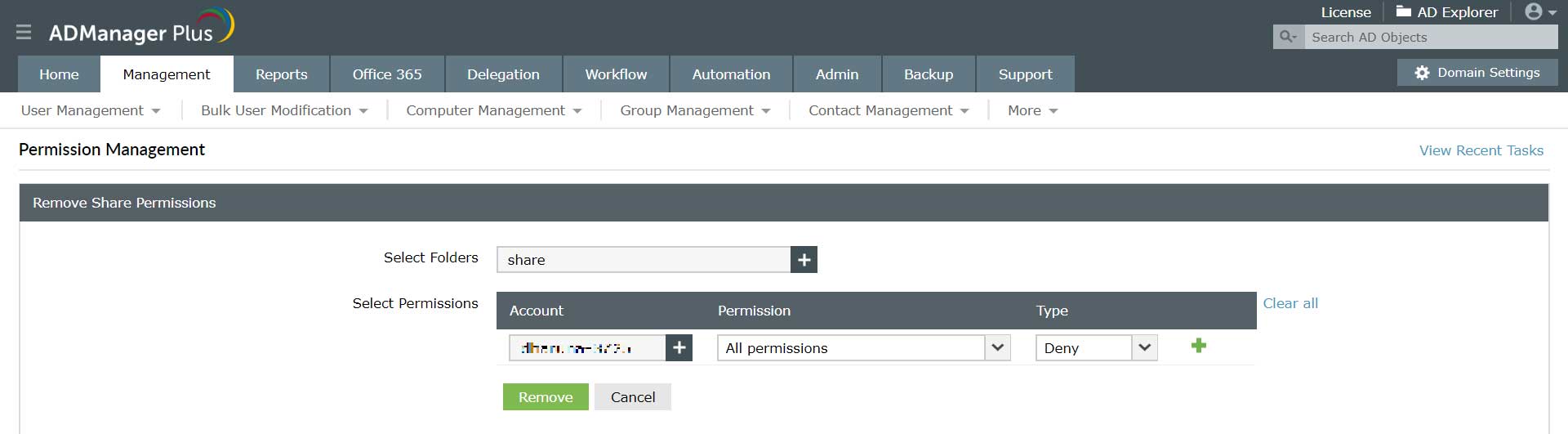 ADManager Plus oferuje cztery sekcje działań w sekcji zarządzania serwerem plików. Są to: