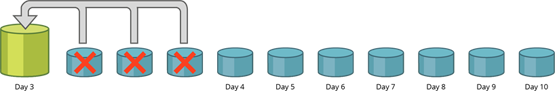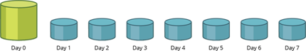Zakładając, że ustawi się okres przechowywania kopii zapasowych na siedem dni, ósmego dnia liczba dni, dla przyrostowych kopii zapasowych przekracza ustawioną wartość w zasadach przechowywania.