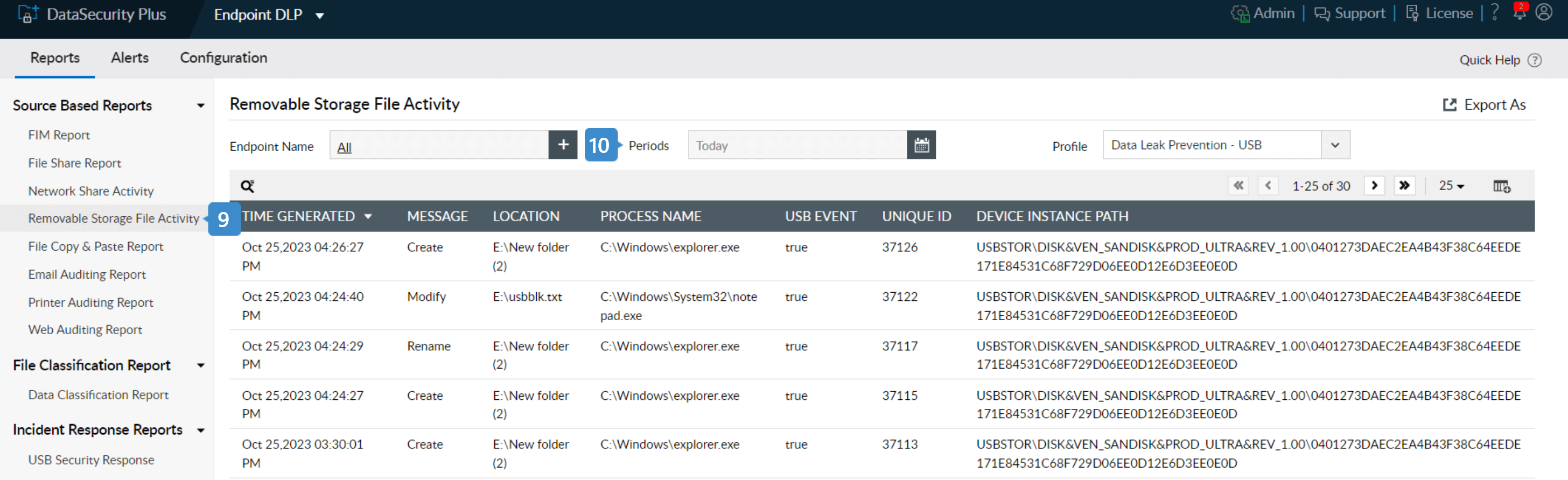 - Użyj menu rozwijanego Okresy, aby wybrać żądany zakres czasu, w którym mają być monitorowane działania związane z plikami w magazynach wymiennych, takich jak USB.