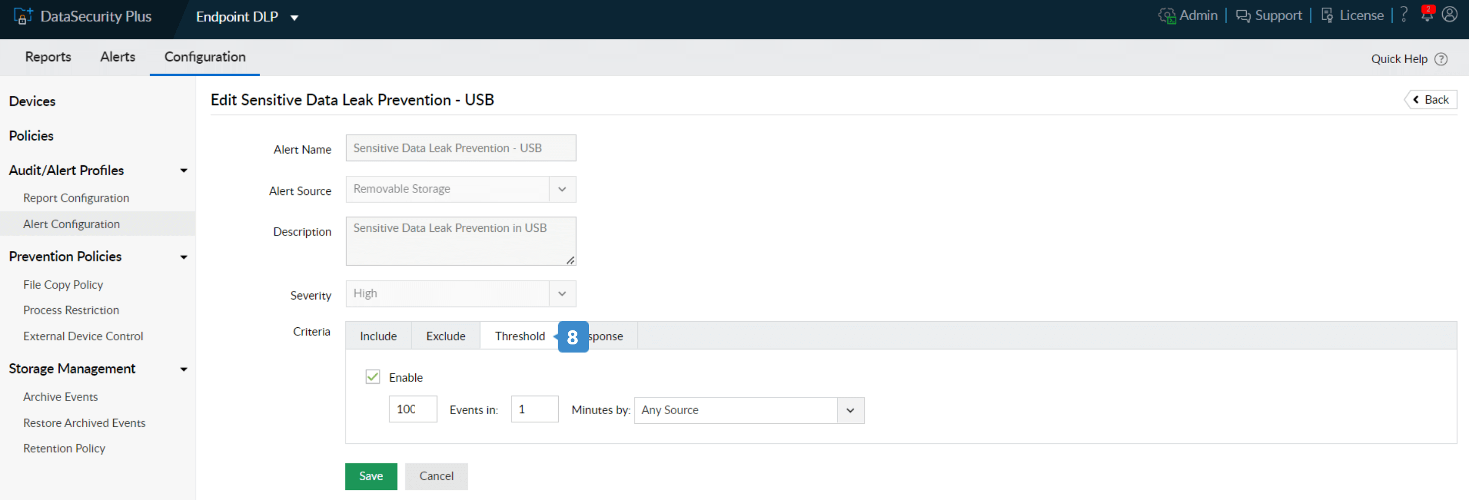 - Określ żądaną wartość progową (np. skonfigurowanie „100 zdarzeń w ciągu 1 minuty z dowolnego źródła” spowoduje podniesienie alertu, gdy 100 lub więcej plików zostanie skopiowanych/wklejonych w ciągu mniej niż minuty).