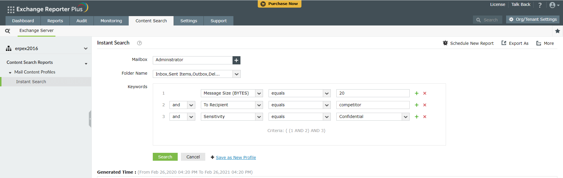 Program Exchange Reporter Plus oferuje proste rozwiązanie do wyszukiwania treści, za pomocą którego można tworzyć kryteria oparte na atrybutach, wzorcach lub słowach kluczowych. Korzystając z wielu filtrów warunków, można szybko i dokładnie zawęzić wyniki wyszukiwania. Można tworzyć i planować profile przeszukiwania zawartości, które w razie potrzeby będą generowane i wysyłane do interesariuszy.