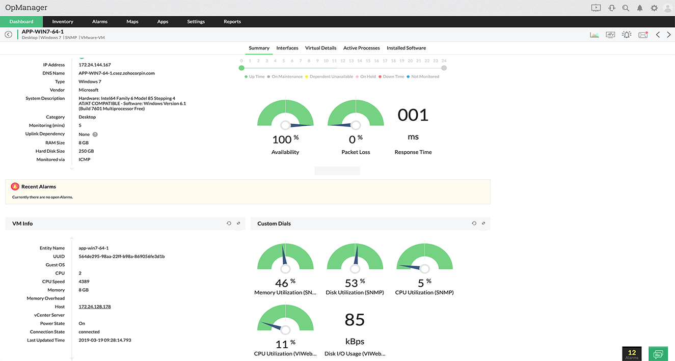 OpManager jest rozwiązaniem do kompletnego monitorowania z obszernymi możliwościami monitorowania CPU. OpManager korzysta z protokołów SNMP, WMI i CLI do monitorowania urządzeń i zbierania informacji. Wyświetla wykorzystanie CPU oraz inne ważne parametry CPU i pozwala je generowa