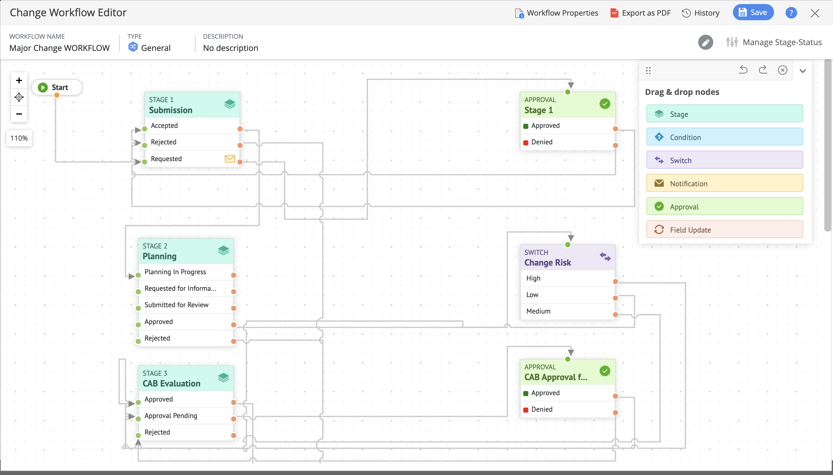 - Twórz przepływów pracy dla różnych typów zmian za pomocą metody "przeciągnij i upuść".