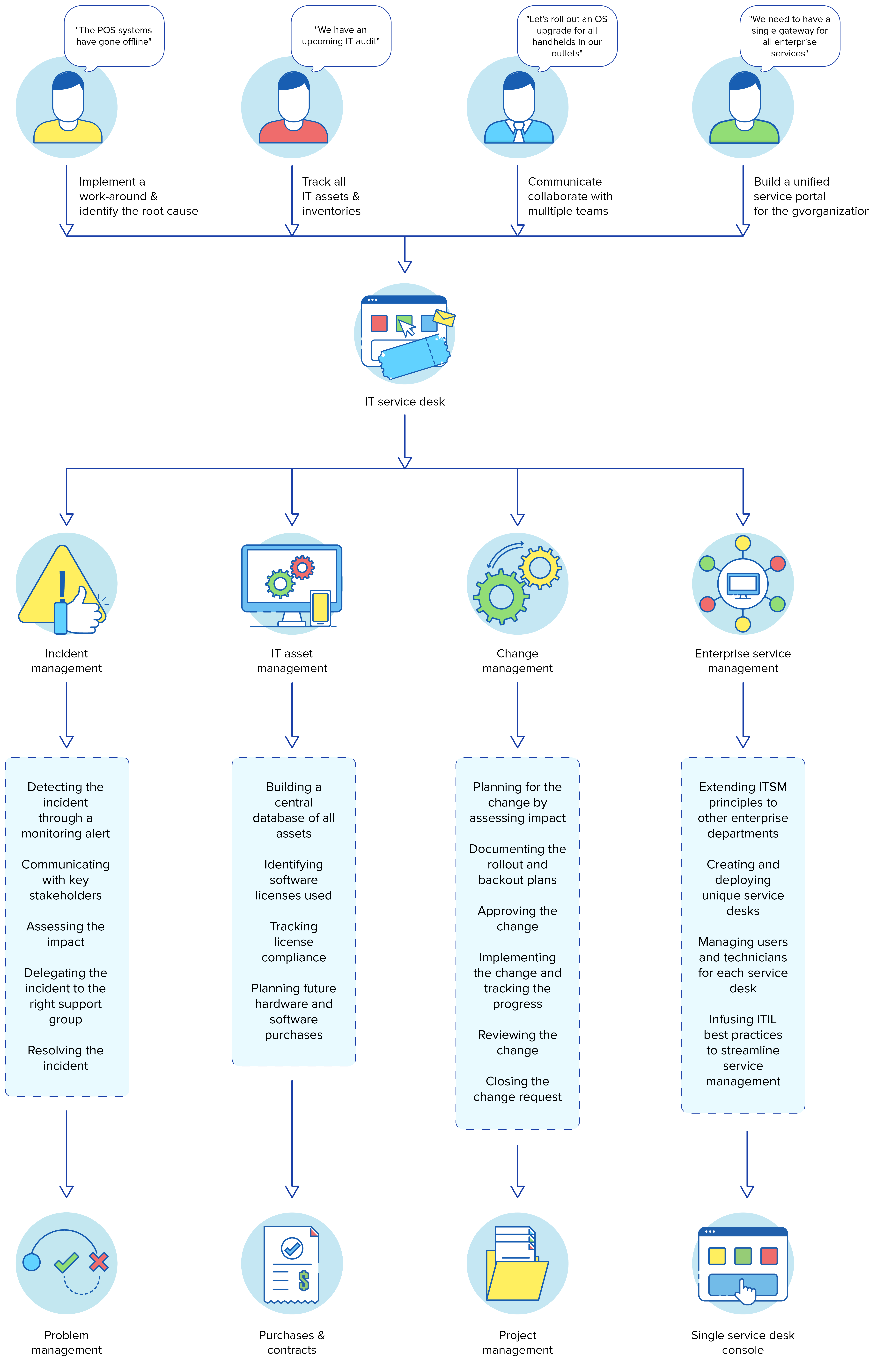 Dzięki szerokiemu wachlarzowi funkcji ITSM ServiceDesk Plus umożliwia organizacjom detalicznym wprowadzenie najlepszych praktyk branżowych do codziennych działań ITSM, zwiększenie wydajności operacyjnej i zapewnienie klientom lepszych doświadczeń.