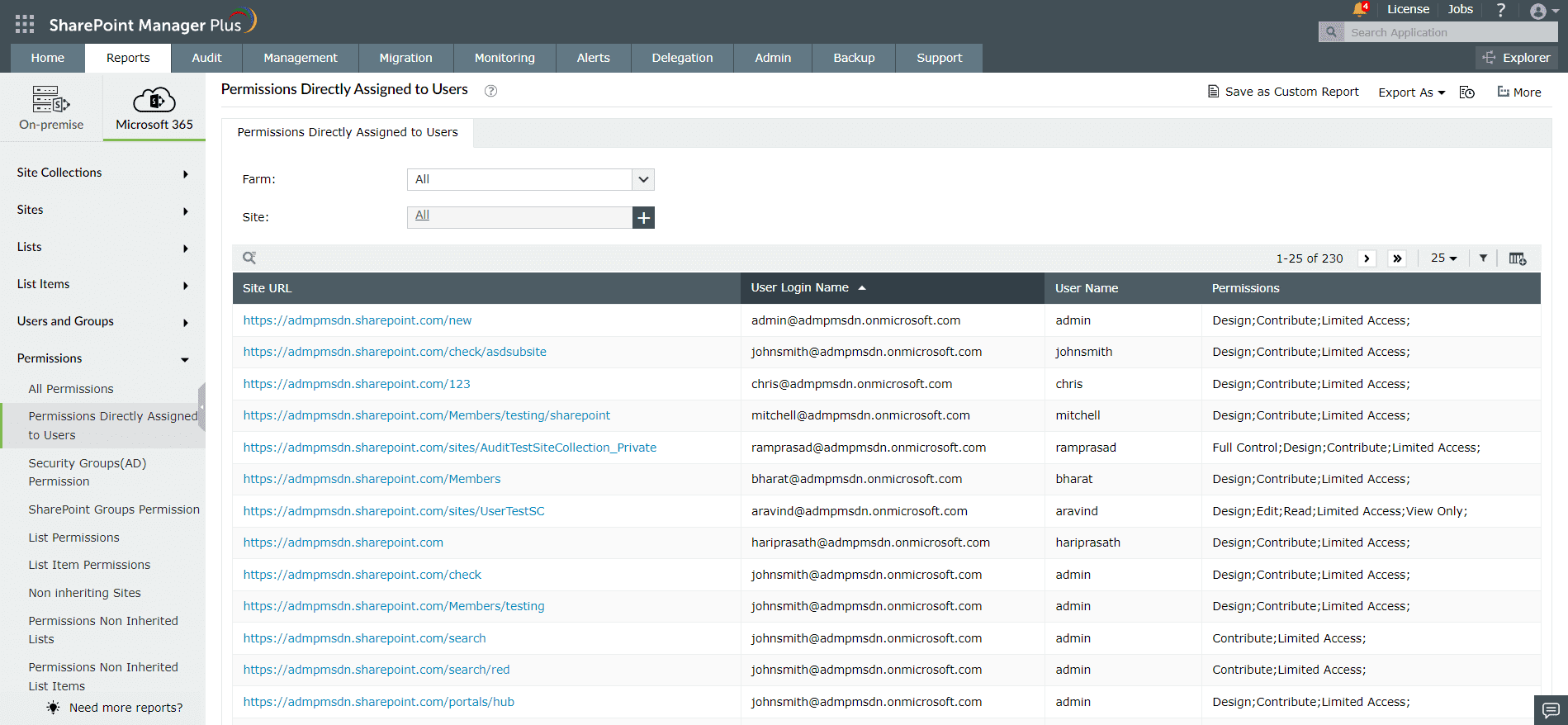 SharePoint Manager Plus — składnik do zarządzania, inspekcji, tworzenia raportów i monitorowania programu SharePoint w usłudze AD360, naszym ujednoliconym rozwiązaniu IAM — dostarcza raporty o zabezpieczeniach zarówno dla lokalnych, jak i internetowych wersji środowiska programu SharePoint, co jest niezwykle pomocne dla organizacji korzystających z obu typów środowisk. Raporty o zabezpieczeniach mają dwie kategorie: raporty o uprawnieniach oraz raporty o użytkownikach i grupach.