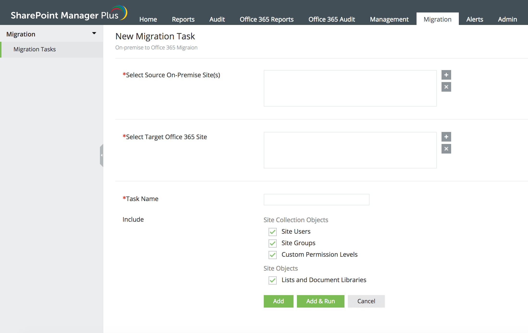 Przeprowadź migrację całych witryn lub ich części do usługi Office 365 za pomocą SharePoint Manager Plus. Wybieraj poszczególnych użytkowników witryny SharePoint, grupy witryn, niestandardowe poziomy uprawnień, listy, dokumenty i biblioteki.