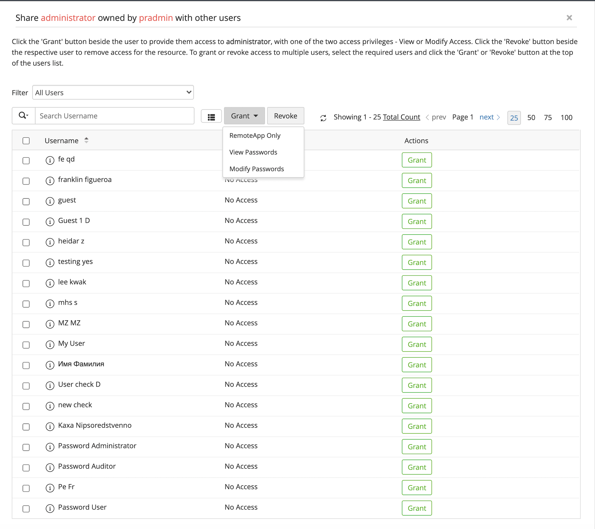 PAM360 allows sharing of passwords and other sensitive information to select users and groups under varied permission levels, such as View, Modify, and Manage. Admins can also transfer ownership of their passwords to other admins and users at their discretion.