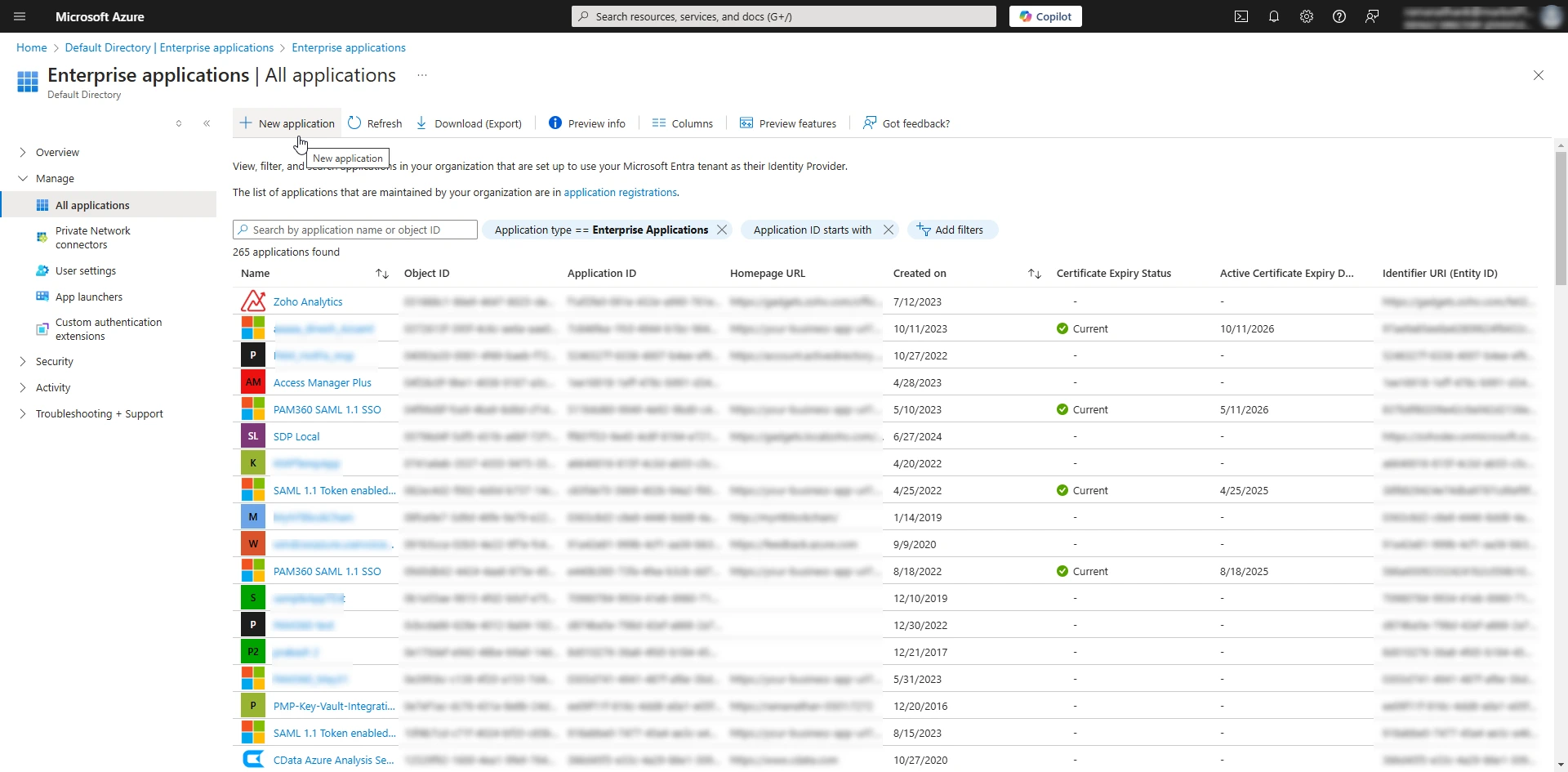 - Log in to the Microsoft Entra ID portal and access the PAM360 Enterprise Application page.