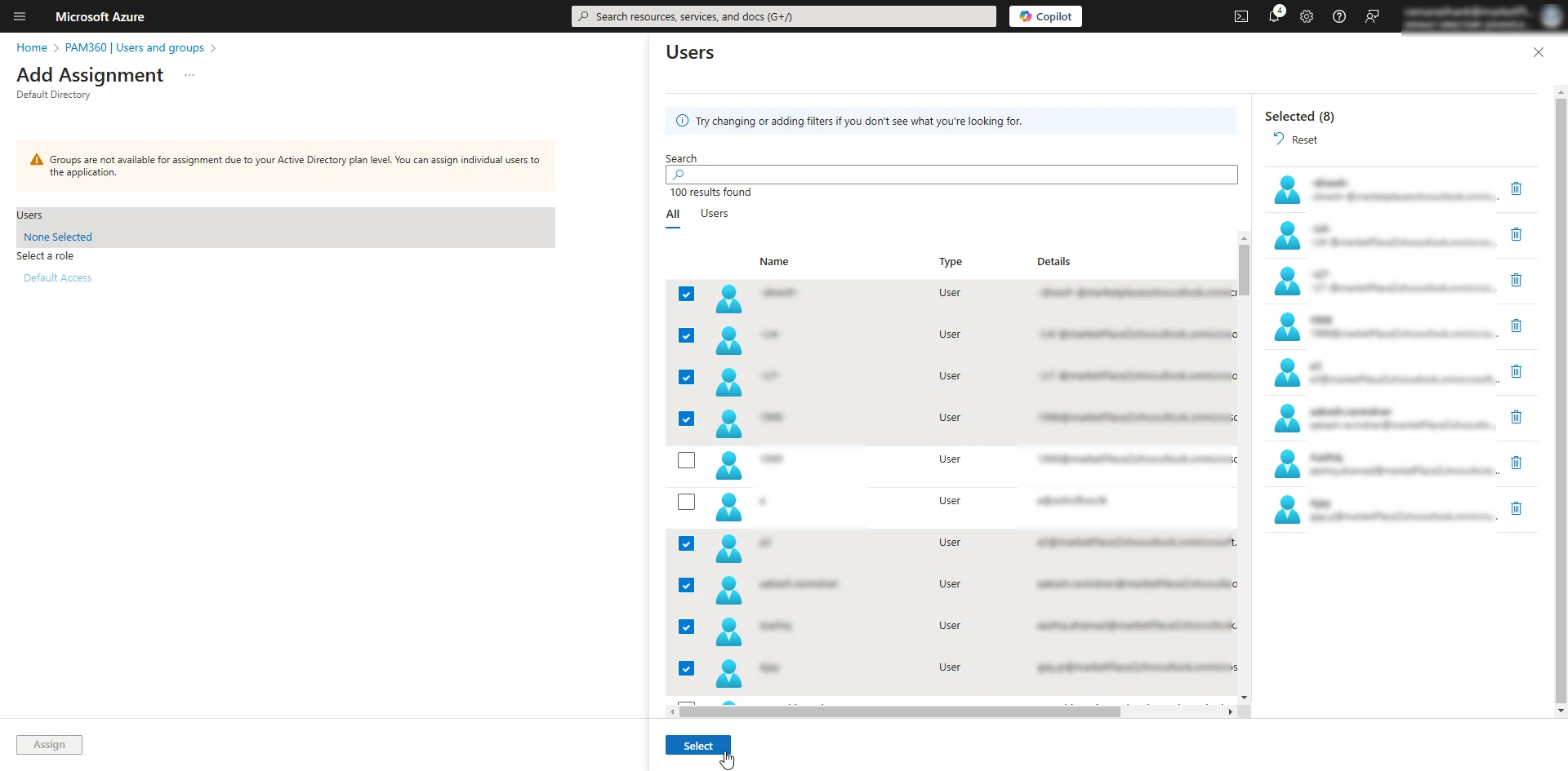 - On the Users window, you will see a list of all the Entra ID users in your directory. Tick the checkbox beside the desired users from the available list and click Select.
