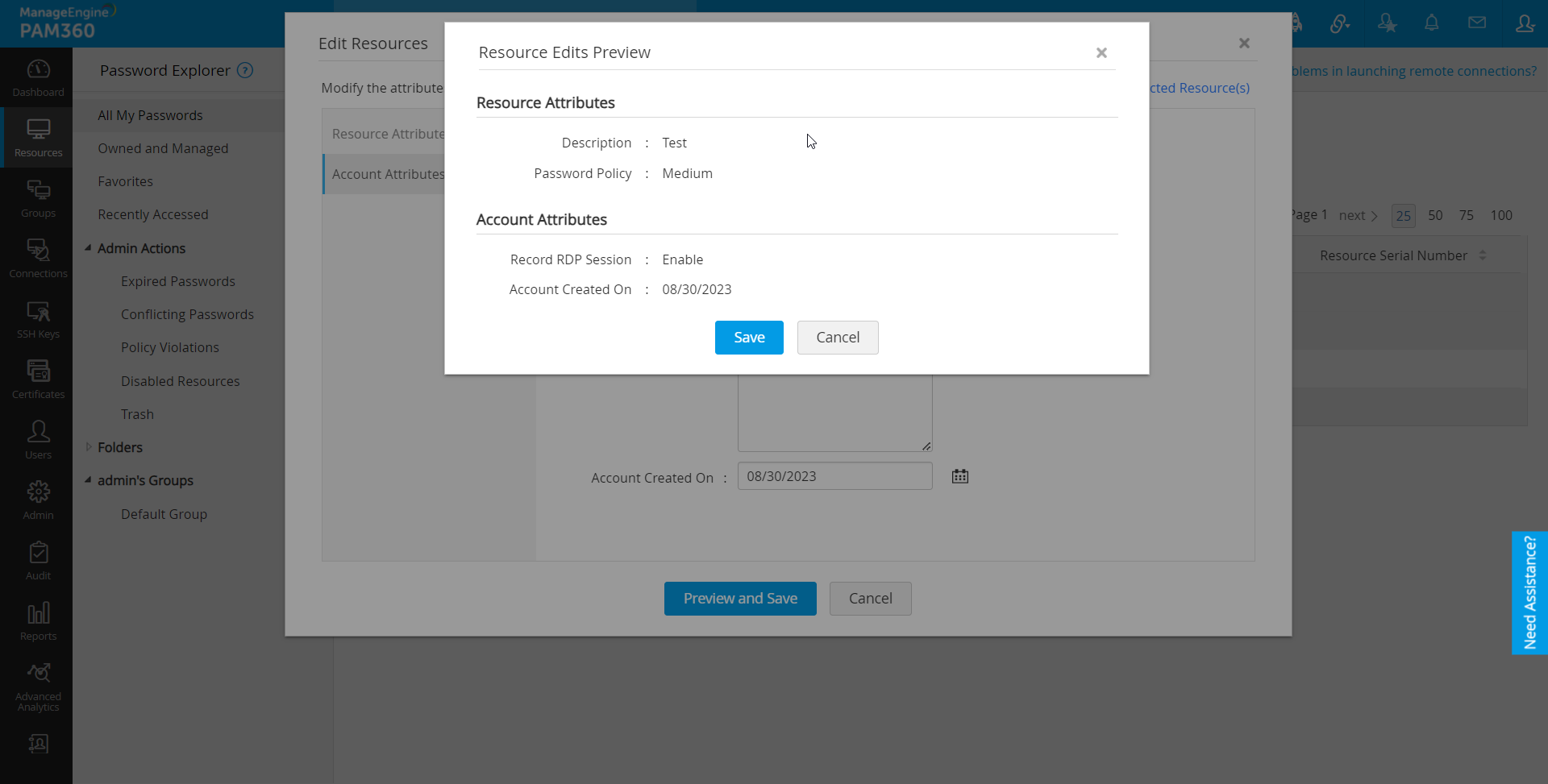 The changes you made will be applied to the selected resources with respect to the resource types. For example, if the selected resources include both Windows and Linux resource types and both RDP session recording and SSH/Telnet session recording are enabled in the Account Attributes tab, you can take RDP session recording only for the Windows resources and SSH/Telnet session recording only for the Linux resources. You can also review the changes made in bulk edit from the Audit tab.