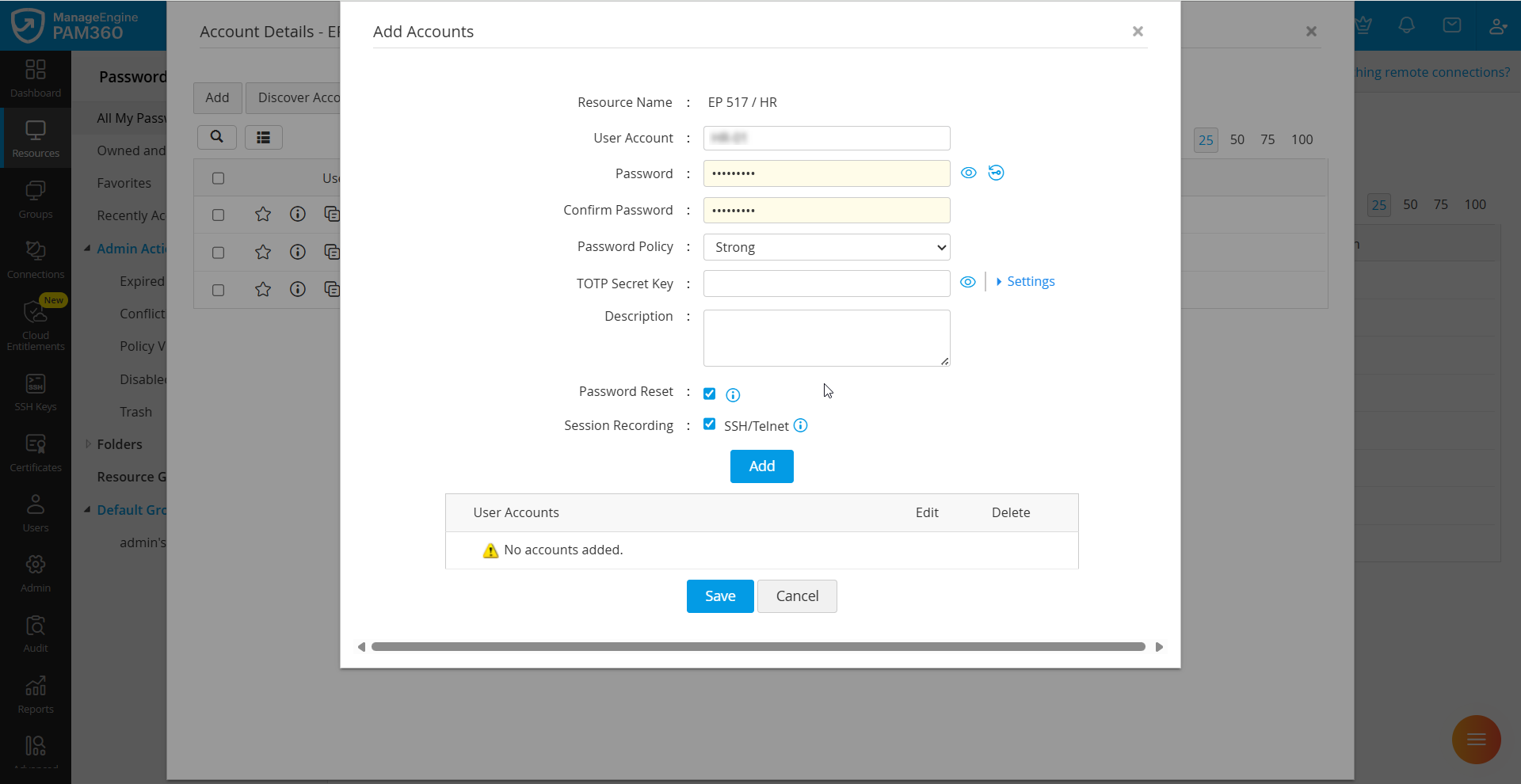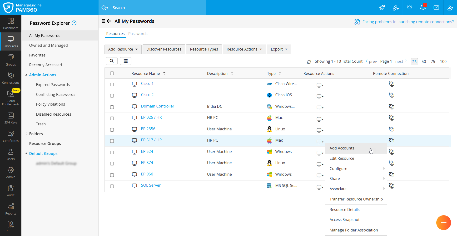 You can delete those resources that are no longer required from the PAM360's Resources list. If you delete a resource, all the accounts and passwords that were part of that resource would also be deleted permanently. Alternatively, you can choose to move a resource to Trash from which it can be restored at a later point of time.