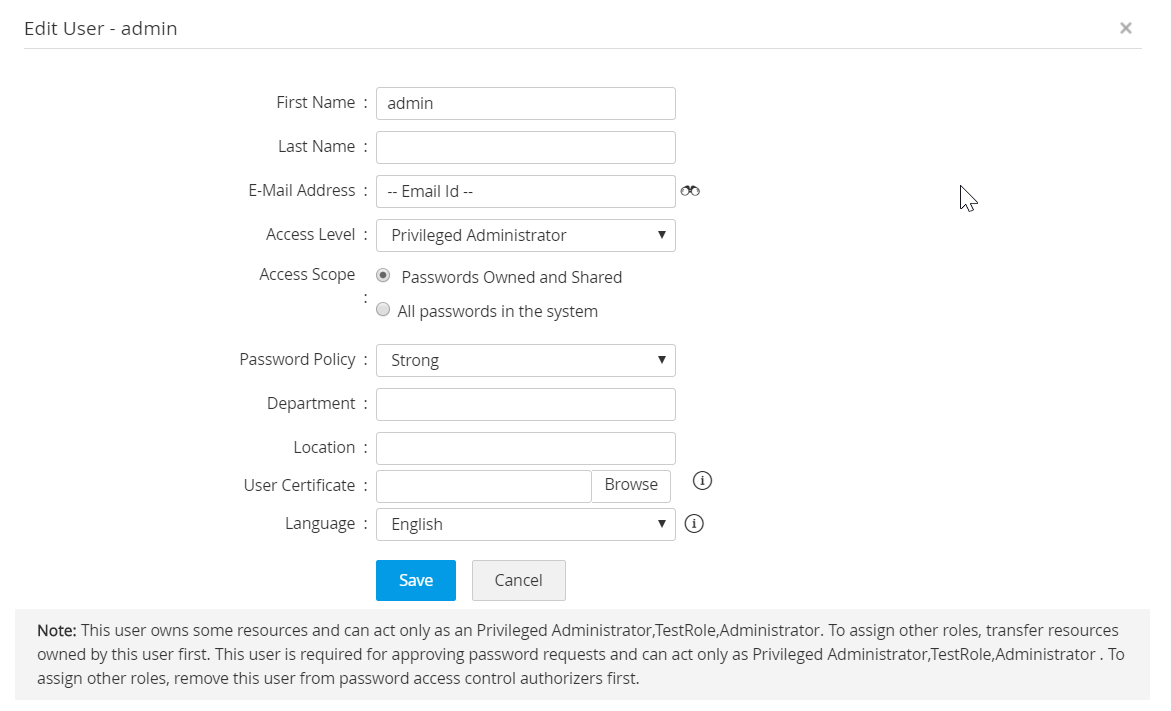 - PAM360 will allow users to be deleted only if the user/users do not own any resource. If the user owns any resource, then you need to transfer the ownership of all the resources to some other user with an administrator-type role.