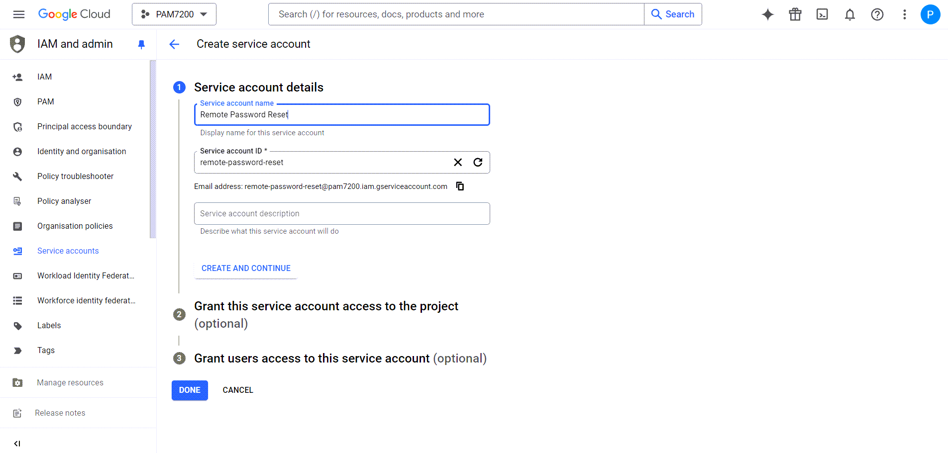 PAM360 supports remote password resets of Google Workspace accounts within your Google Workspace domain using a service account. To enable this, you should set up a service account within a project in your Google Workspace domain and configure it to execute password resets. When a password reset operation for a Google Workspace user account is triggered in PAM360, the service account resets the password of the selected Google Workspace account. Therefore, before configuring the remote password reset operation for a Google Workspace account in PAM360, you must set up and configure a service account on the Google Cloud Platform (GCP) Console.