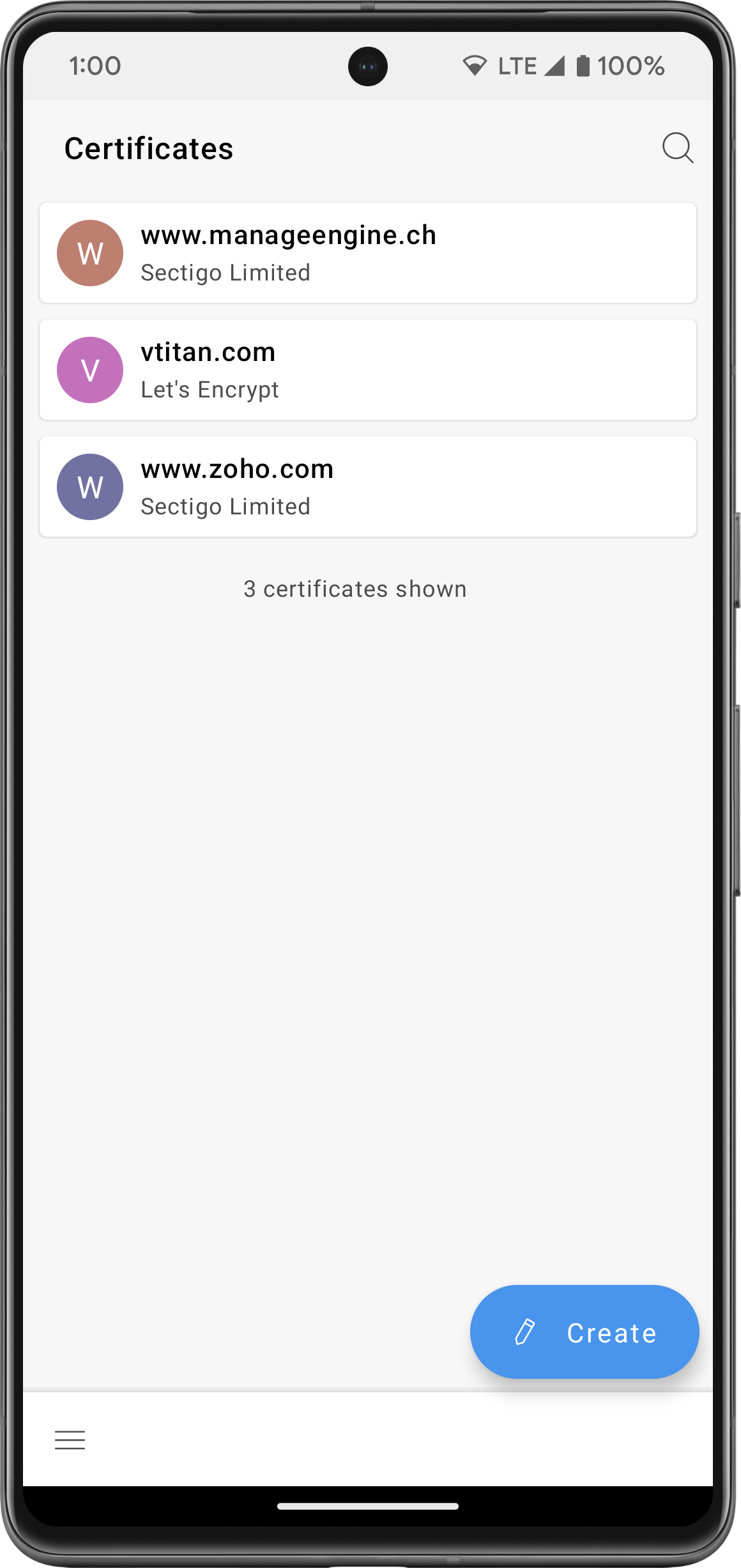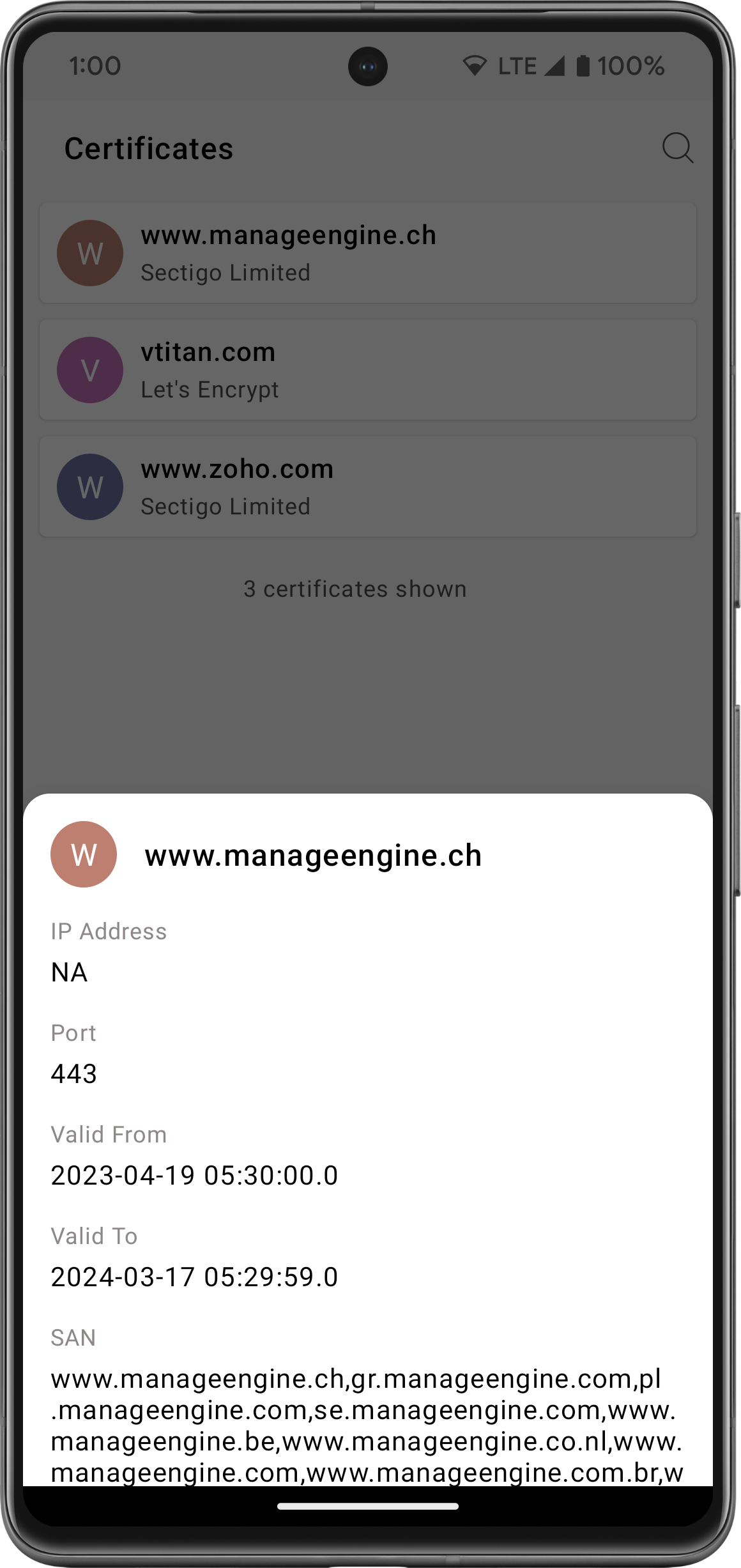 Tap the Certificates option from the navigation menu to view all the SSL certificates that you are managing in the PAM360 repository. Tap any SSL certificate from the list to view the following certificate details: IP Address, Port, Validity period, SAN, Issuer, Signature Algorithm, Finger Print, Serial Number, Key Algorithm, Key Size.