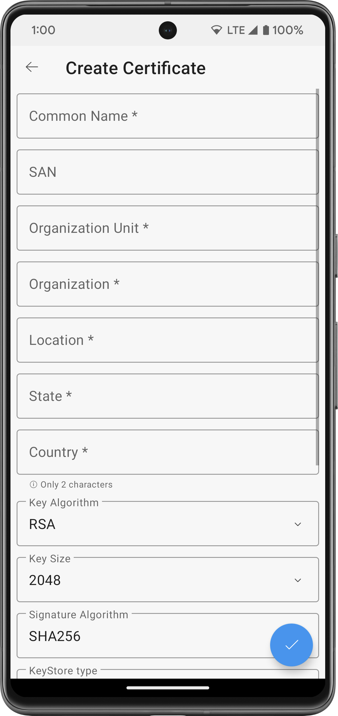 - Select the Key Algorithm, Key Size, Signature Algorithm, and KeyStore type from the respective dropdowns.