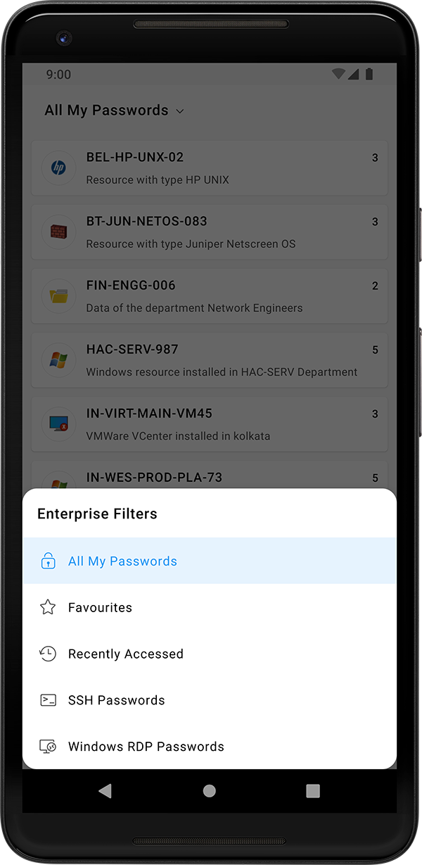 By default, the application displays a list of all the resources on the main screen. From here, tap on any resource to view the accounts associated with it. Tap the hamburger icon at the bottom left corner to open the Navigation Menu. In this menu, tap the Enterprise option to open the All My Passwords page. To view the Enterprise Filters, tap the downward arrow beside All My Passwords. The Enterprise Filters list displays a list of resources owned or managed by you, categorized as below: