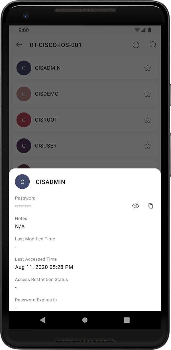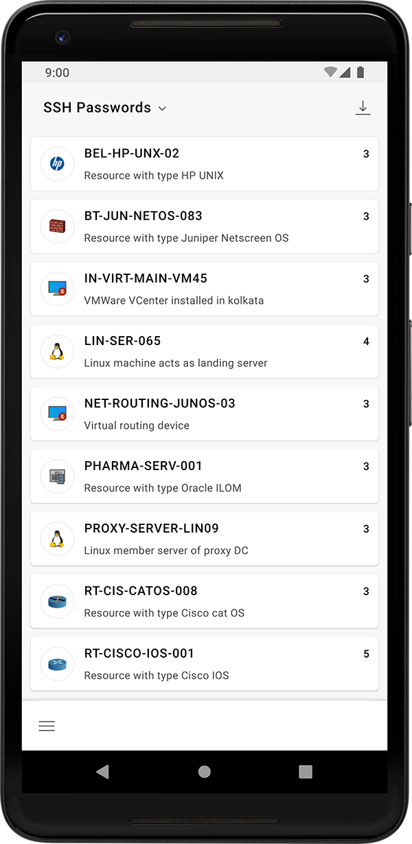 This option gives you a consolidated view of all the resources that you can access through an SSH connection. Tap on any resource on this list to view its user accounts. Tap on any account to view the account details, such as the masked password, last modified time, last accessed time, and password expiry date. Tap the Search icon to search for any account within the selected resource, using a search keyword.