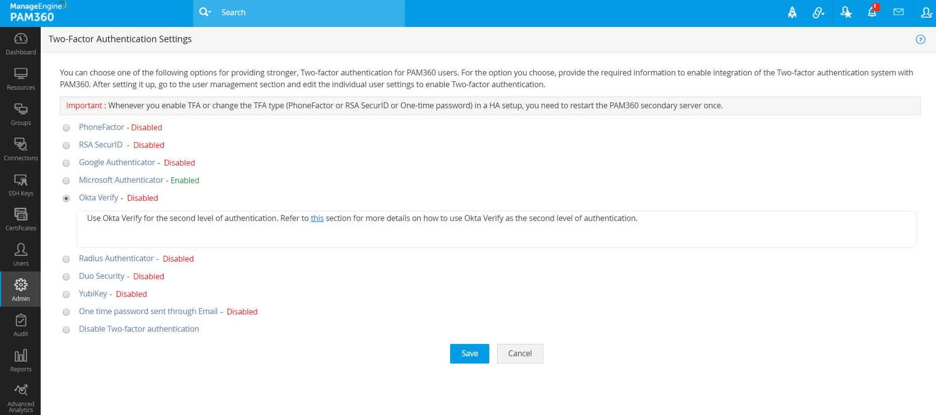 Whenever you enable TFA or when you change the TFA type (PhoneFactor, RSA SecurID, One-time password, RADIUS, or Duo) AND if you have configured high availability, you need to restart the PAM360 secondary server once.