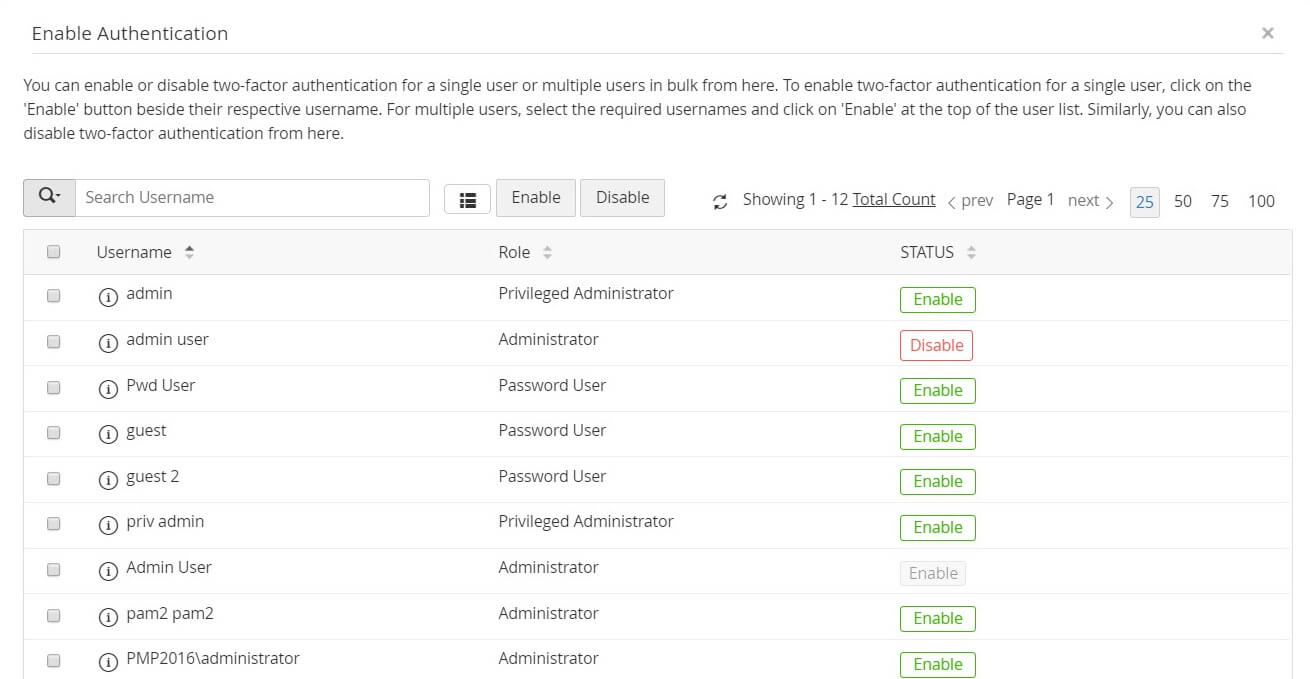 - You can enable or disable TFA for a single user or multiple users in bulk from here. To enable TFA for a single user, click on the Enable button beside their respective username. For multiple users, select the required usernames and click on Enable at the top of the user list. Similarly, you can also Disable TFA from here.