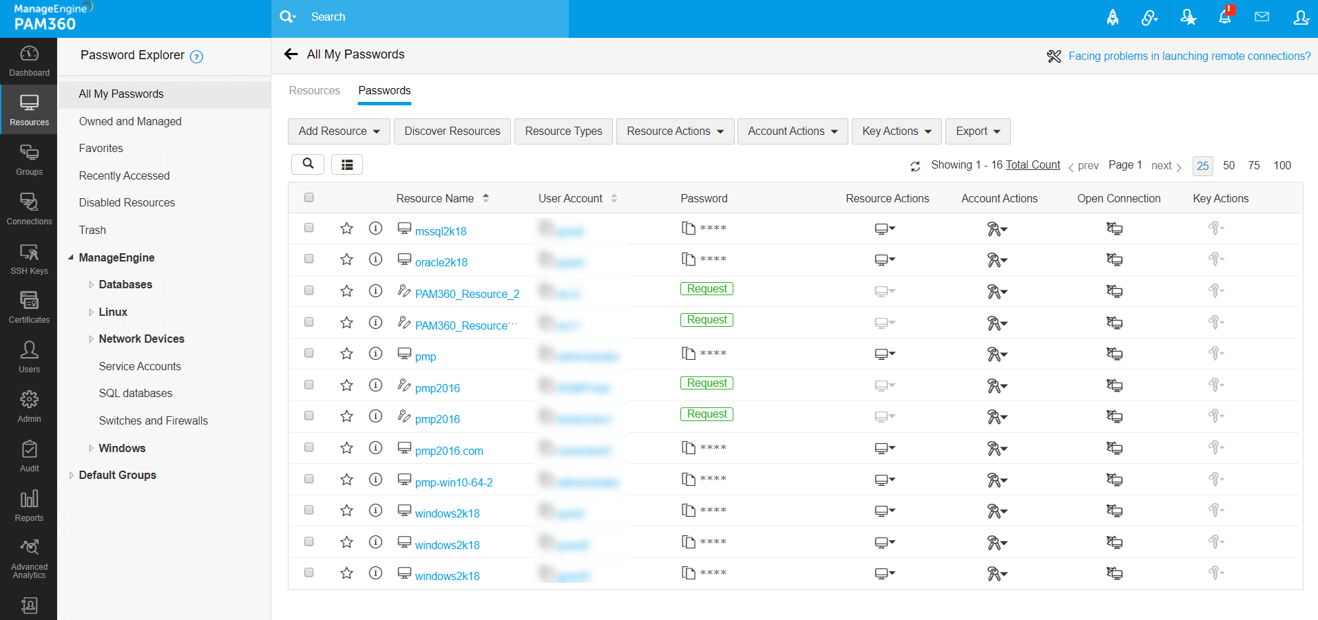 - Ensure you have configured remote password reset using the necessary credentials with password reset privileges to reset the passwords after each use. Explore these links for the detailed steps to configure remote password reset for resources available on the same network as the PAM360 server and those managed via the PAM360 agents.