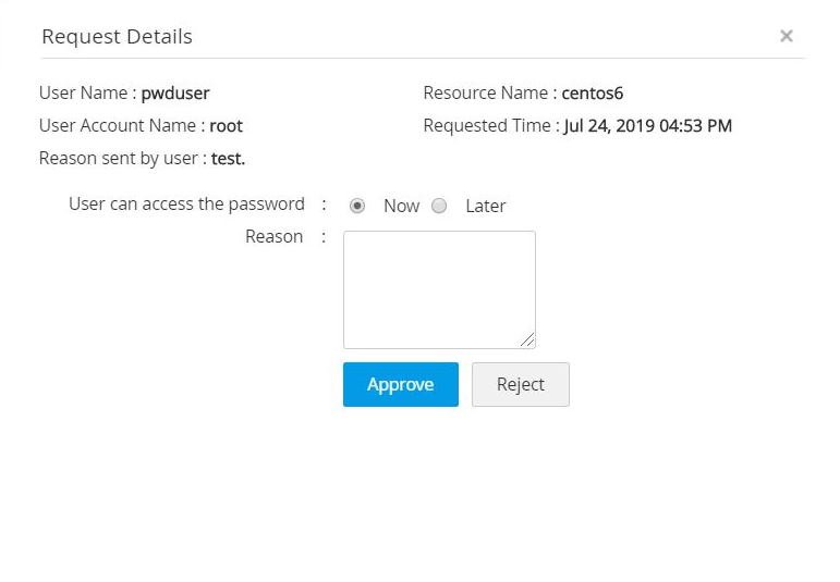 - In the Password Access Request Review pop-up window, you will find the relevant details about the password access request.