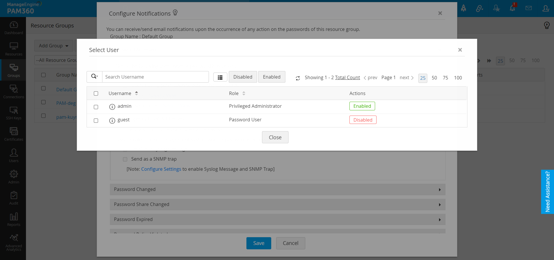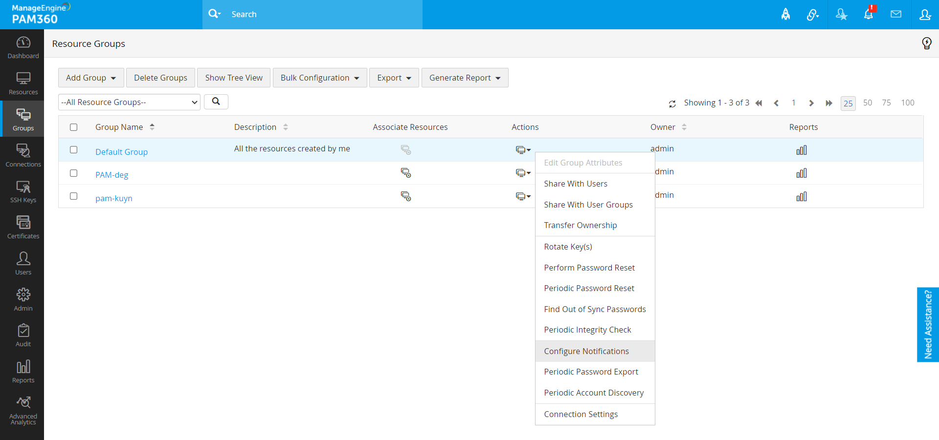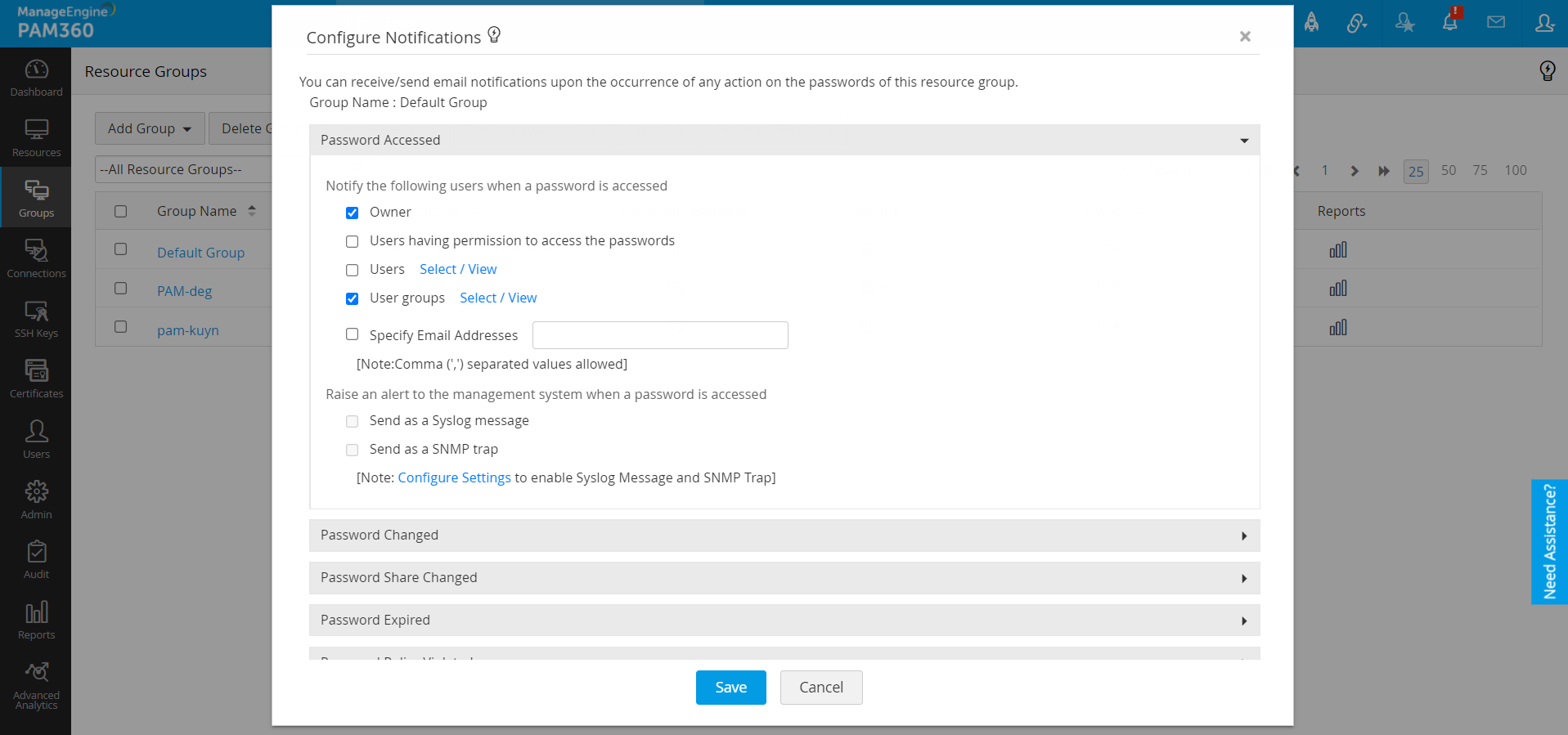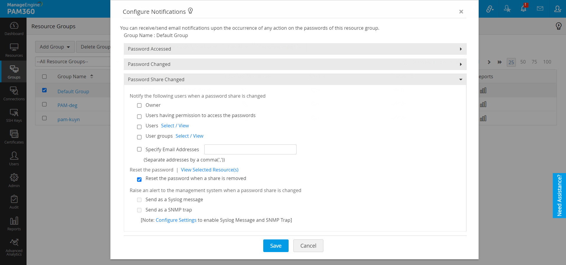 In addition to notifications, especially when password shares are changed or when passwords expire, you can also configure password reset actions to be performed automatically by PAM360. Password Action Notifications can be configured only at a resource-group level.