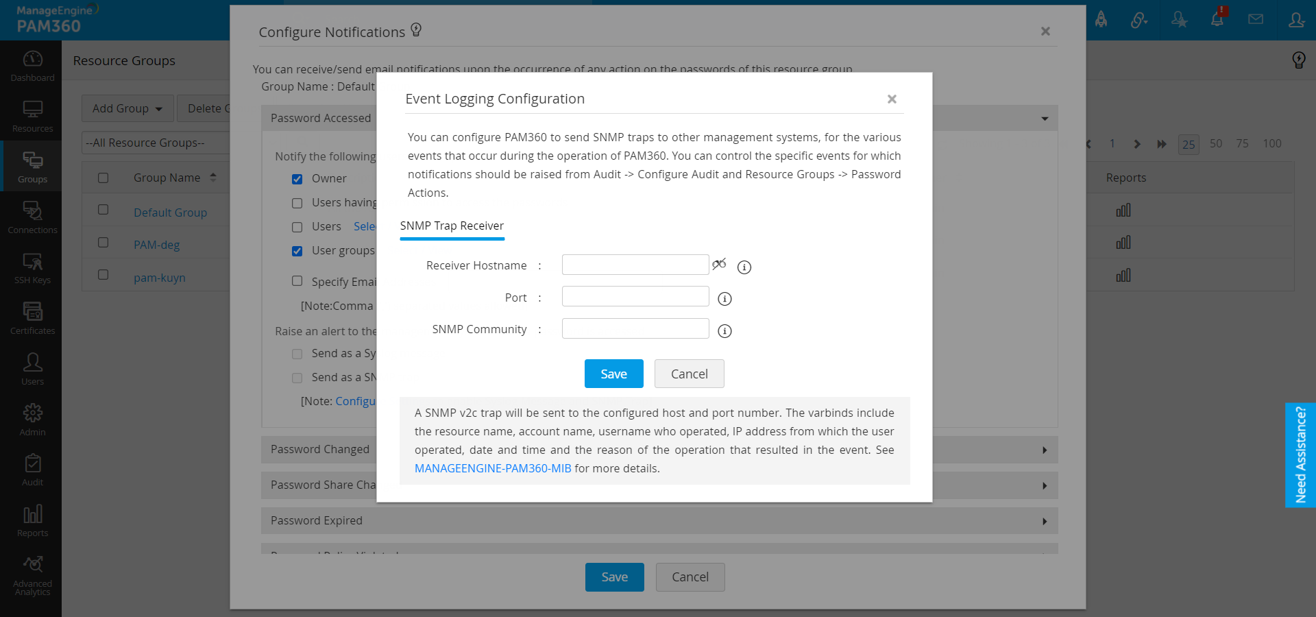 - Apart from the above, you can also generate SNMP Traps to your network management system. Before selecting these options in the Configure Password Actions window, make sure you have globally configured these settings under Admin >> Integrations >> SNMP Traps. Refer to related help doc here.
