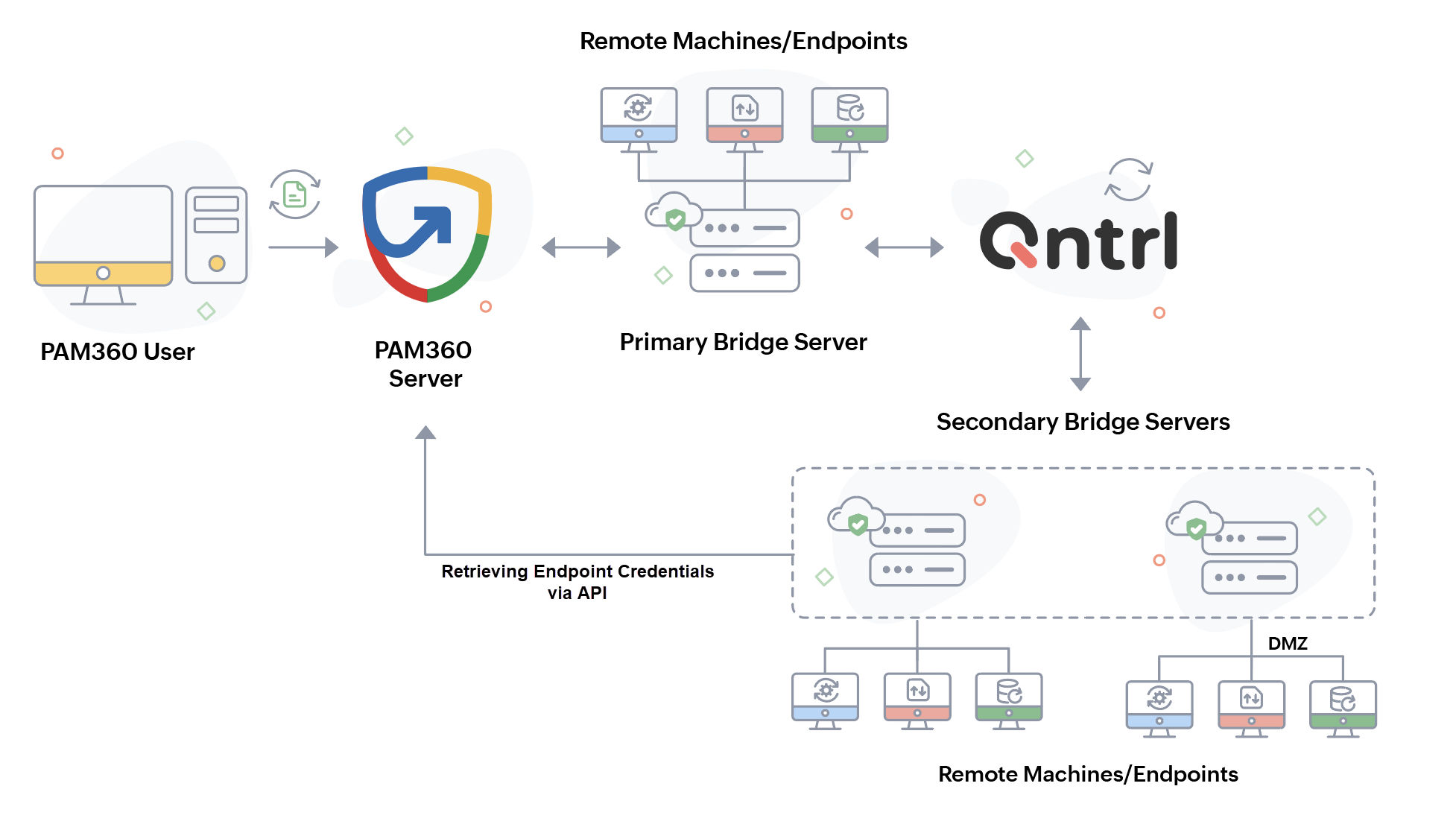 - Secure Execution: Qntrl Circuits validates the request and assigns the task to the appropriate Bridge Server for execution. If privileged credentials are required, the Bridge Server securely retrieves them from PAM360 using the designated APIs and executes the task on the designated target system.