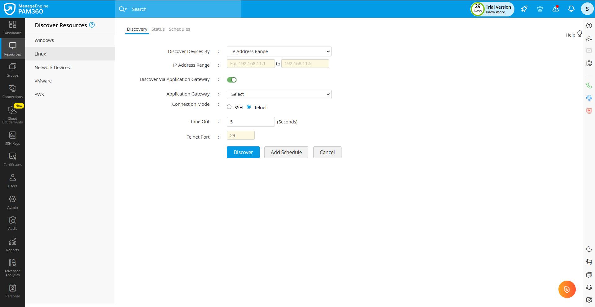 - Administrators can add resource discovery schedules to periodically discover and onboard Linux resources in environments that are not directly connected to the PAM360 server.