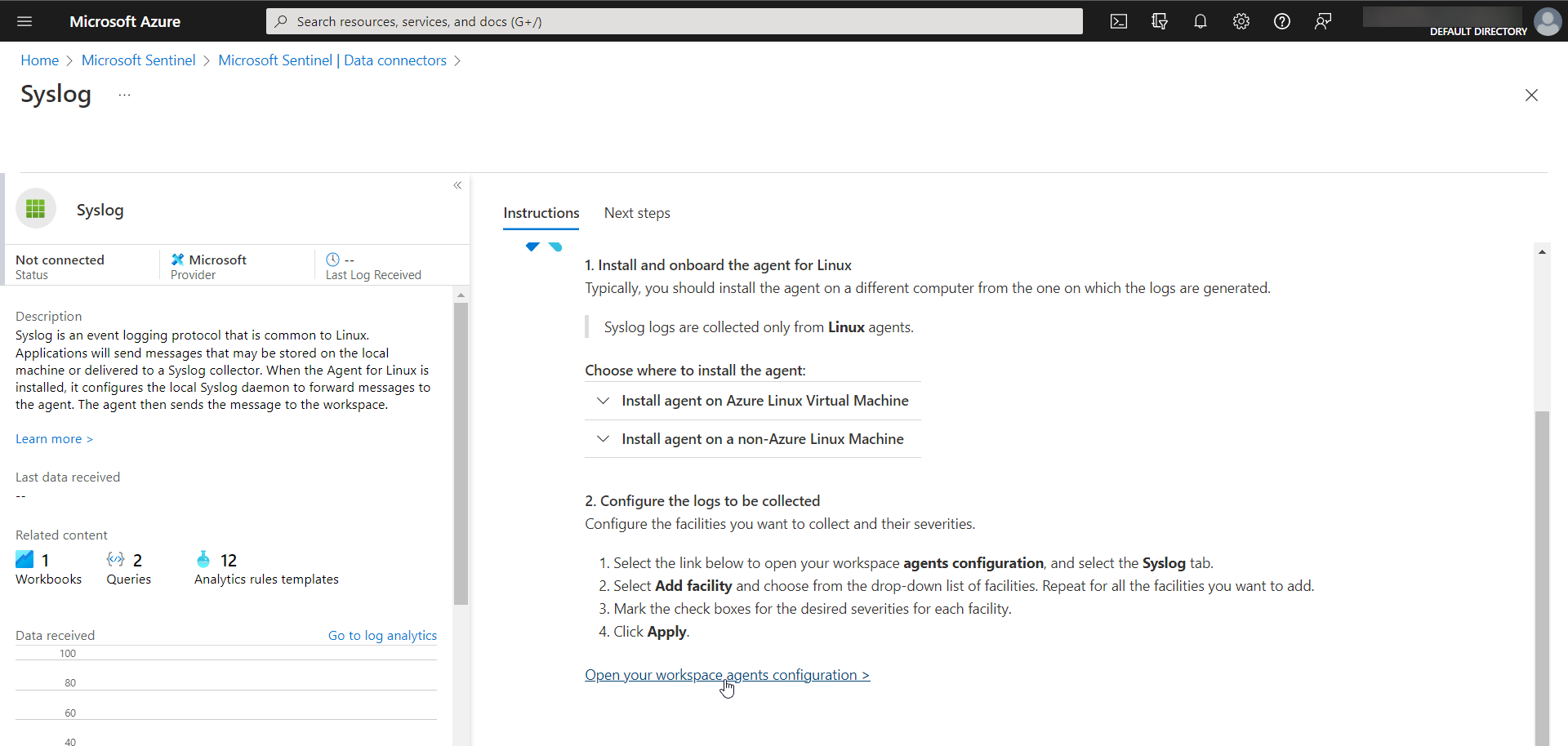 4. The Syslog configuration page will open up. Here, under Configuration, you will find two steps. Under step 2 Configure the logs to be collected, click the link Open your workspace agents configuration.