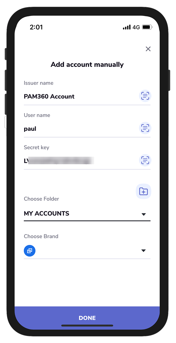 - Select Manual Entry and enter the Issuer name, User name, and the Secret key. The Secret Key is the alphanumeric key shown in the PAM360 GUI.