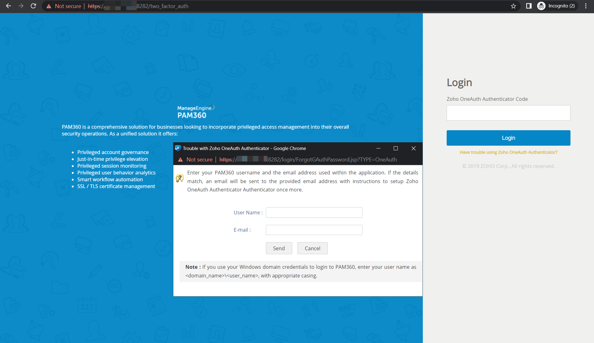 - You will be prompted to enter your PAM360 Username and the Email address associated with PAM360.