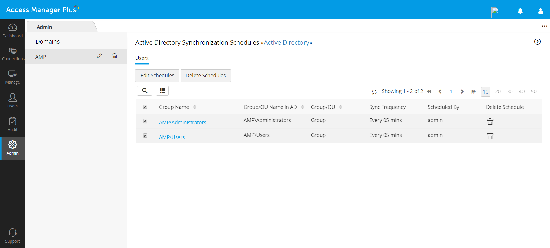 - In the Active Directory Synchronization Schedules page, synchronization schedules configured for various groups or OU will be displayed