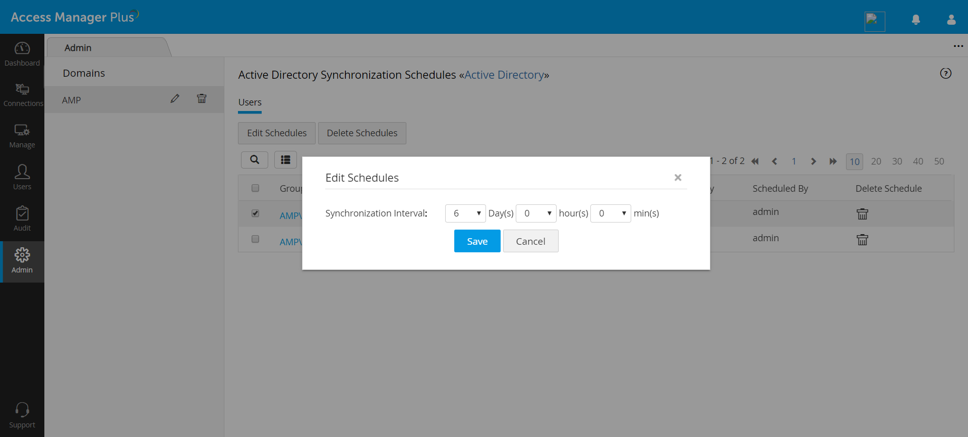 To set up a synchronization schedule, enter a time interval while importing users from AD. Once the schedule is set, Access Manager Plus will query the Active Directory at the specified intervals to keep the user database updated. The time interval could be as low as a minute or it can be in the range of hours/days.