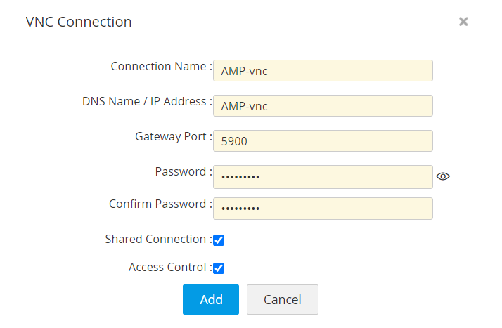 - Once all attributes are provided, click Add. The VNC-based remote system will be added as a Connection in Access Manager Plus.