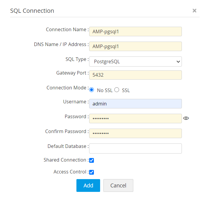 - By default, all connections are private at the time of adding. Select the Shared Connection checkbox to make the connection public and accessible to other users.