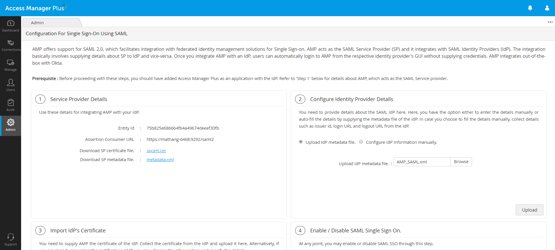 - You can get the Entity ID and Sign on URL from the Access Manager Plus interface.