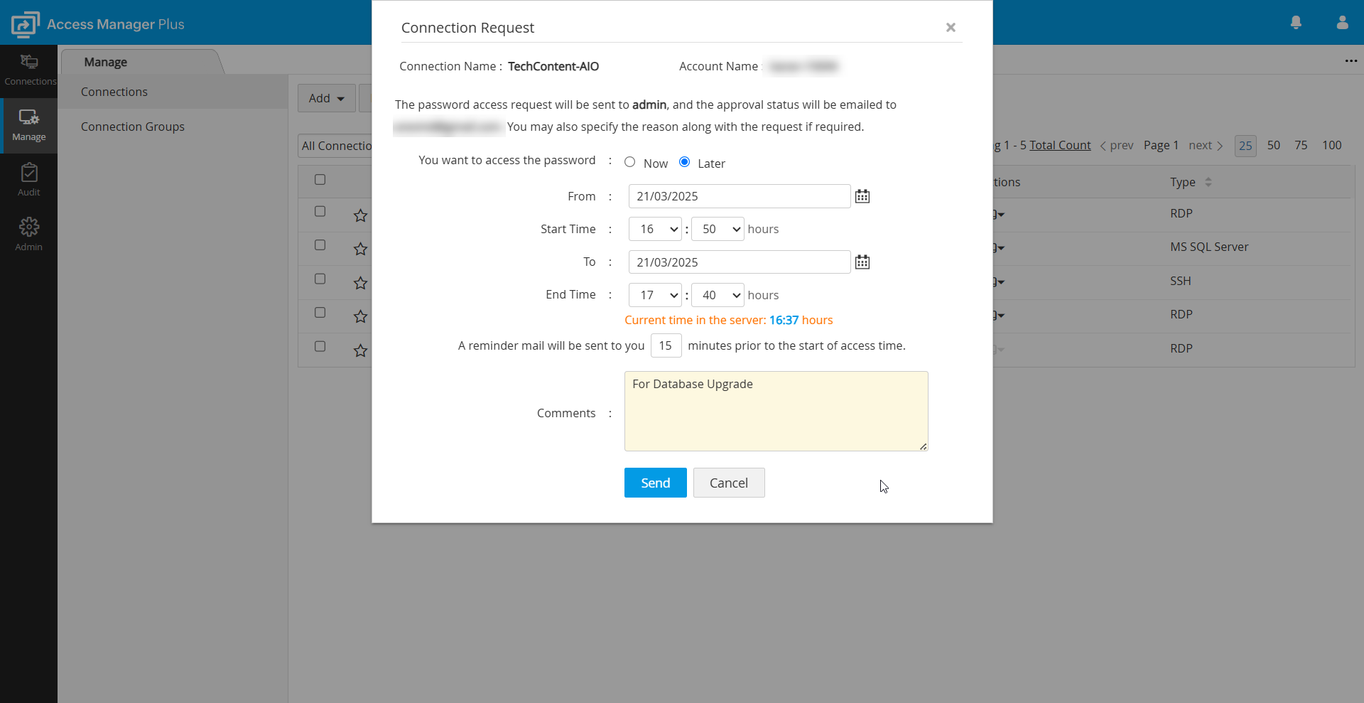- Send a reminder email to the owners asking to process the password access request before X minutes of the stipulated time: Use this option to set a time at which a reminder email will be sent to the connection owner about the access request that is yet to be approved. Access Manager Plus will send the reminder email at the specified number of minutes before the void time.